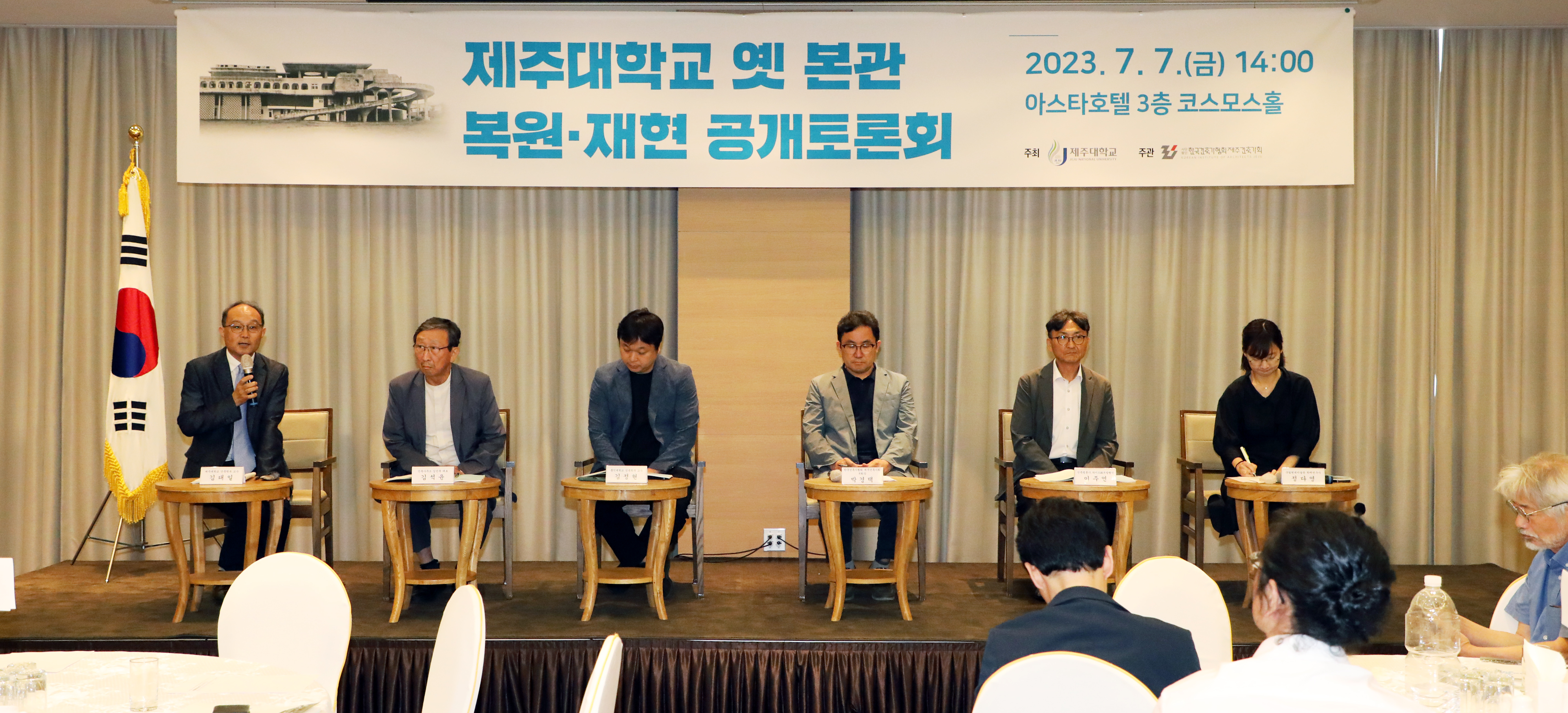 제주대 김일환 총장은 인사말을 통해 “제주대 옛 본관은 고 김중업 선생님의 대표작으로 제주대학교가 국립대학으로 승격하던 첫해 사업으로 추진된 제주대학교의 상징과도 같은 건축물이다. 제주대학 발전사의 단면을 드러낼 뿐만 아니라 우리 한국 건축사의 한 획을 긋는 중요한 사회적 자산이다”며 “재건 논의를 공론화하고 다양한 의견을 수렴하겠다”고 토론회 개최 의의를 전했다. 이날 주제발표로는 이용규(제주대학교 건축학부 교수)+손종남 건축사(오피스툴 건축사사무소)가 ‘제주대 옛 본관의 건축적 특성 및 복원, 그리고 재현의 접근과 과제’, 곽재환 건축사(칸 건축사사무소.주)가 ‘제주대 구 본관, 제주의 꿈과 희망으로 부활하라’, 김중업건축박물관 정재은 학예팀장이 ‘제주대학교 구 본관 재현 후 활용방안’에 대해 발표했다.