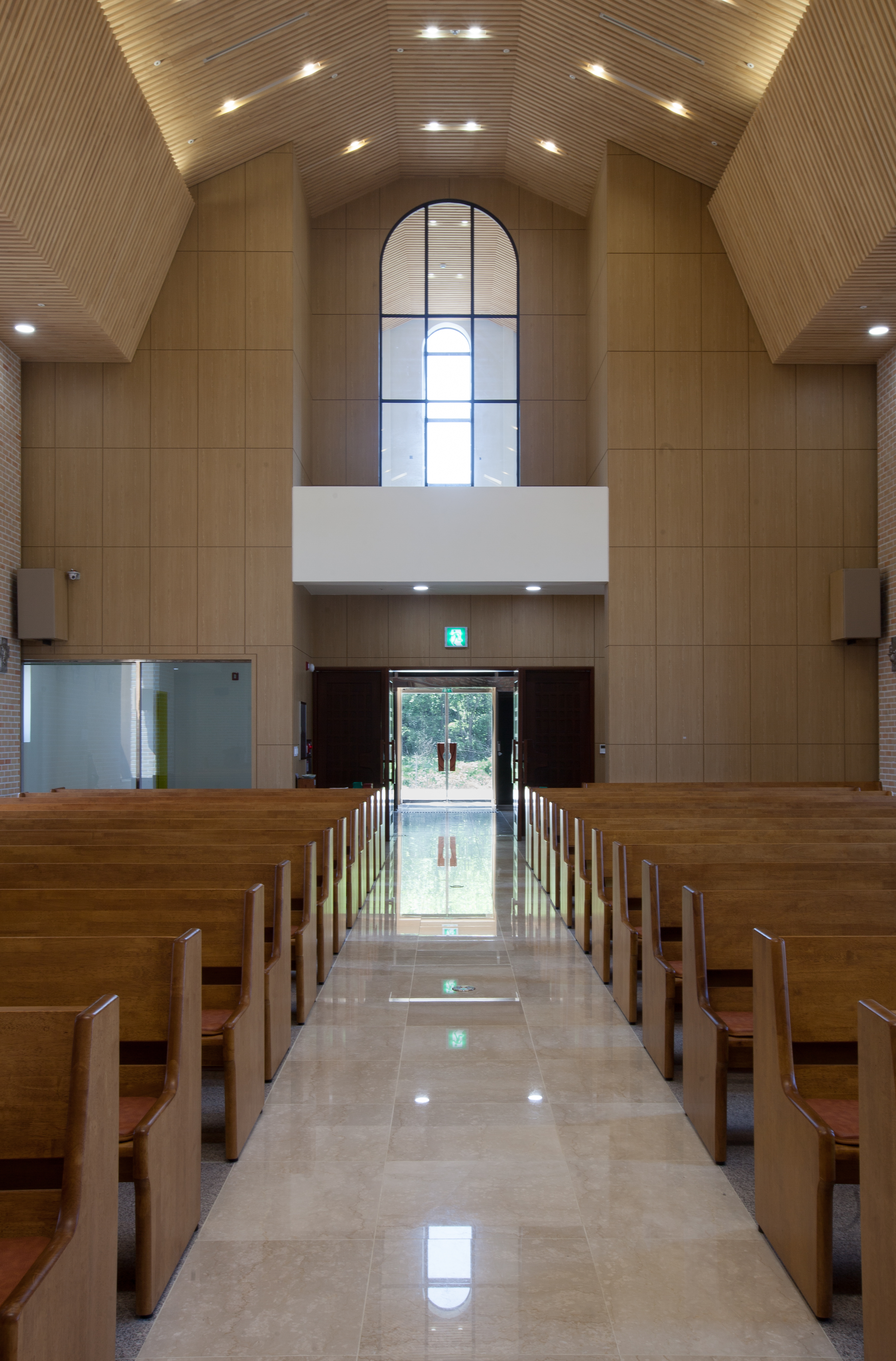 The cathedral is located on one side of the Wollang-ri field and is surrounded by little cottages in the surrounding hills. The layout was planned to allow the low hills facing the south to harmonize naturally within the site of the cathedral, rather than outstanding in the middle of the terrain so that it became a mediator to connect mountains, fields and rural villages.If you walk out the door, you will be able to see nature unfold before your eyes, and the low height of offices and doctrine rooms were designed to harmonize with overall terrain.