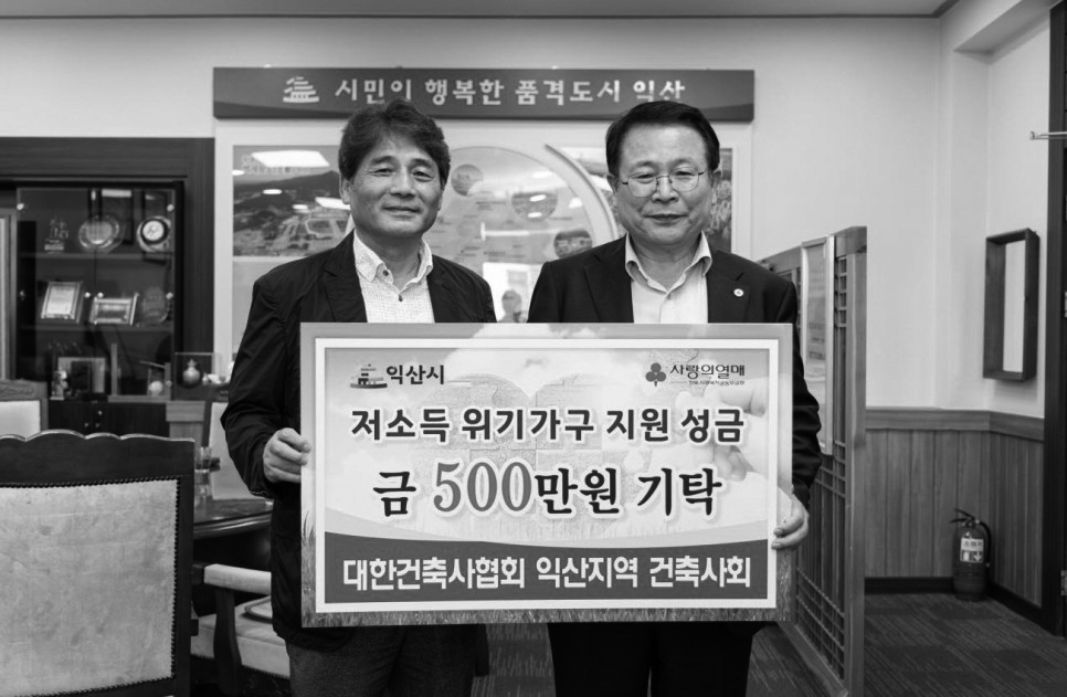 전라북도 익산지역건축사회는 8월 2일 익산시청을 방문해 저소득지원 이웃사랑 성금 500만 원을 기탁했다. 안영묵 익산지역건축사회장은 “작은 정성이지만 우리 지역 어려운 이웃과 상생하고자 하는 마음에 성금을 모았으며, 나눔과 봉사에 지속적으로 동참하겠다”고 말했다.