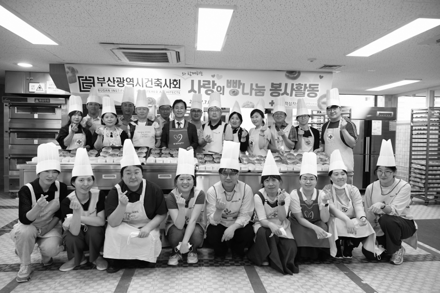 부산광역시건축사회는 지난 8월 7일 대한적십자사 부산지사에서 ‘사랑의 빵 나눔 봉사활동을 진행 기탁했다. 사랑의 빵 전달 사업은 양 기관이 체결한 MOU 협약의 일환으로, 제빵 전문가의 도움을 받아 직접 빵을 만들고 취약계층 등에 전달하는 봉사활동이다.