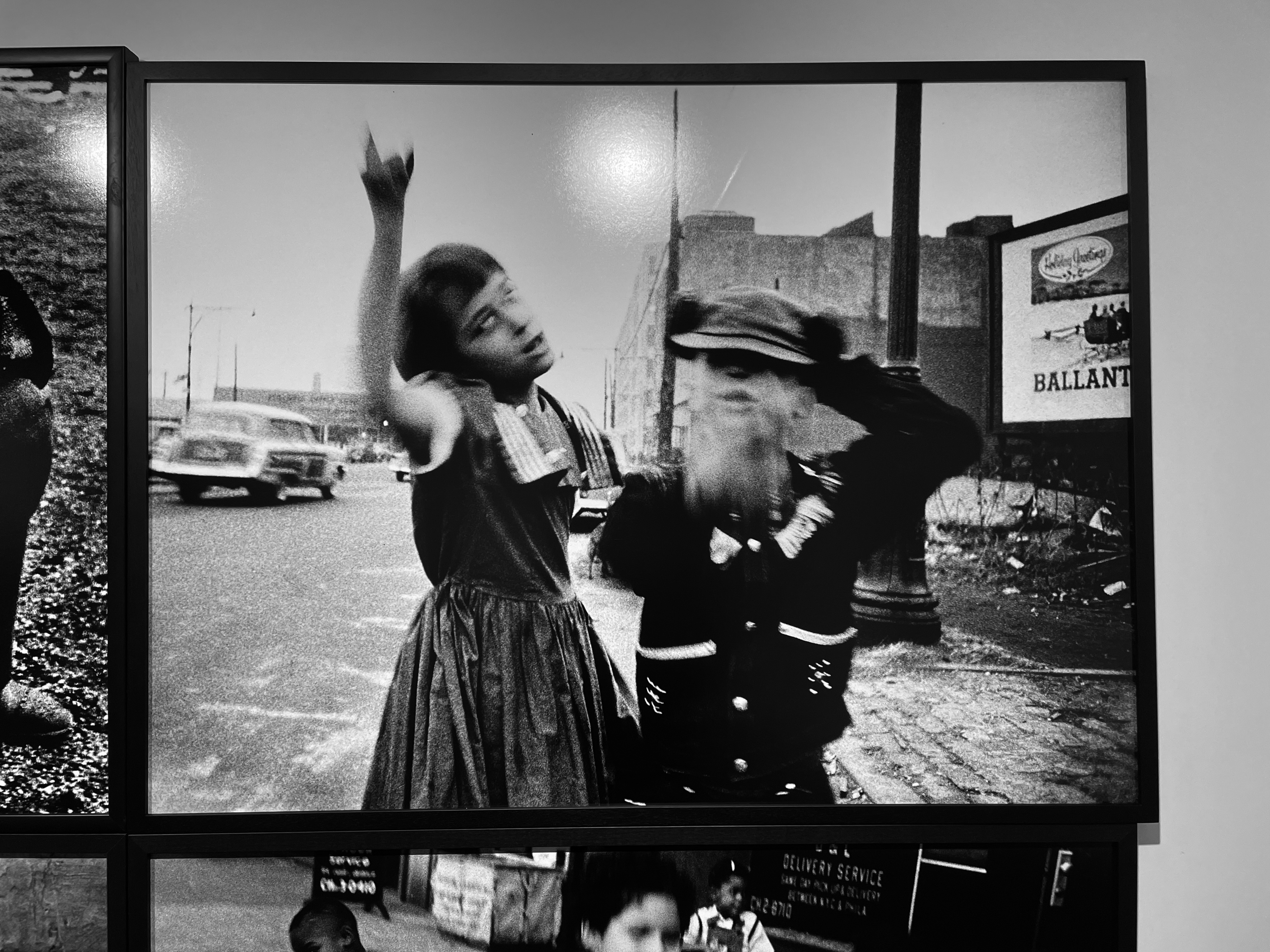 그다음 세 번째 전시장에 가니 비로소 익숙한 윌리엄 클라인의 대표작들이 전시되어 있다.<사진 5> 자신이 사는 뉴욕을 기록한 이 사진들에서 클라인은 비로소 대상에 주목하기 시작했다. 물론 뉴욕 사진에서도 그의 그래픽적 구성사진이 전혀 없는 것은 아니다. 하지만 이 뉴욕 사진의 주인공은 사람이다. 게다가 이 사진들에는 그가 전에 추구했던 구성적 질서가 없다. 사람을 찍을 때 그는 조화롭고 안정적인 구도에는 아무런 관심이 없다. 심지어는 초점도 맞지 않고 노출이 길어서인지 이미지가 흔들려 있다.<사진 6> 사진에 등장하는 뉴욕 사람들은 활기차고 거칠고 버릇없다. 뉴욕이라는 도시의 인종적 다양성, 활력, 혼란을 아무런 기교를 부리지 않고 담았다. 신중하게 계산하지 않고 카메라를 그 삶의 현장 한가운데 들이대서 즉흥적으로 얻은 사진들이다. 질서를 잃은 대신 강렬한 현장감을 얻었다.