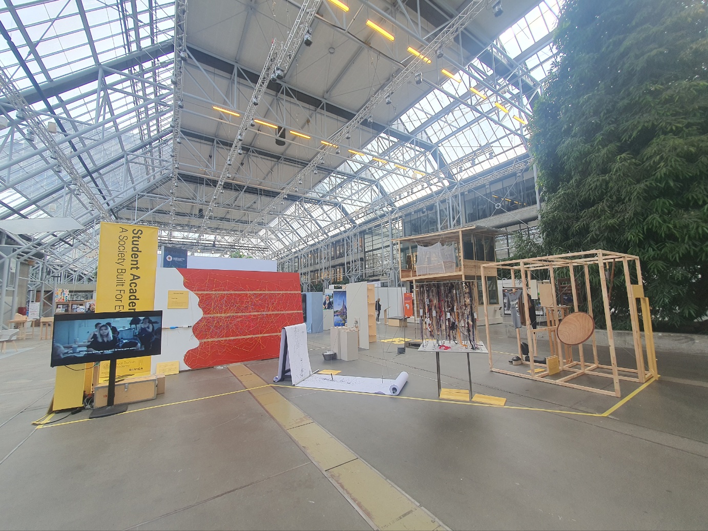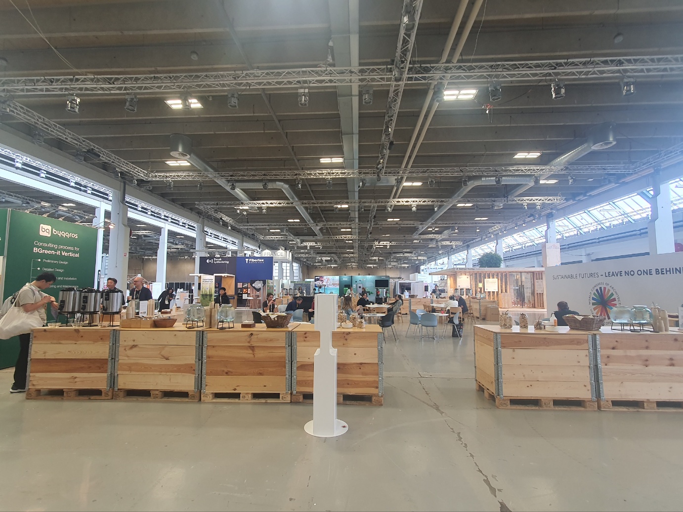 2023 UIA World Congress에는 강연뿐 아니라 각국의 도시와 건축, 그리고 대화를 할 수 있는 각 나라의 전시 부스가 마련되어 있다. 각 나라마다 최근 건축에 대한 동향과 새로운 재료와 기술을 홍보할 수 있다. 한국은 FIKA 전시관, 서울관, LH 전시관 등 3개의 전시관이 설치되었다. 전시관 곳곳에는 친교와 정보교환을 할 수 있는 카페가 있고, 옛날 사과상자 디자인의 카페 선반들은 최소의 제조 공정으로 만들어져 친환경적 이미지를 나타낸다. 불필요한 것에 많은 시간과 자원을 투자하지 않는 것도 친환경적 디자인의 하나의 방법으로 보인다.
