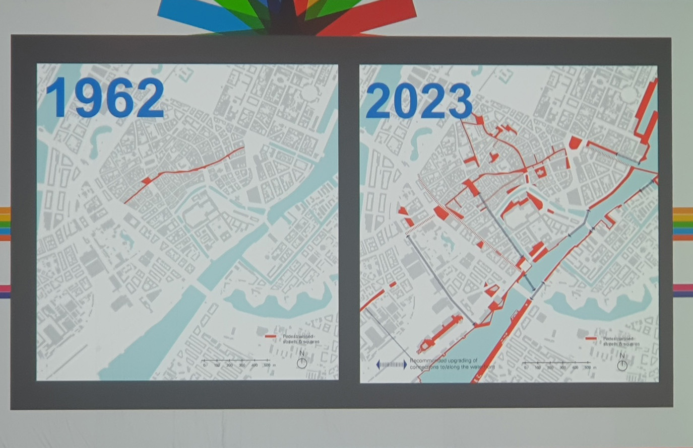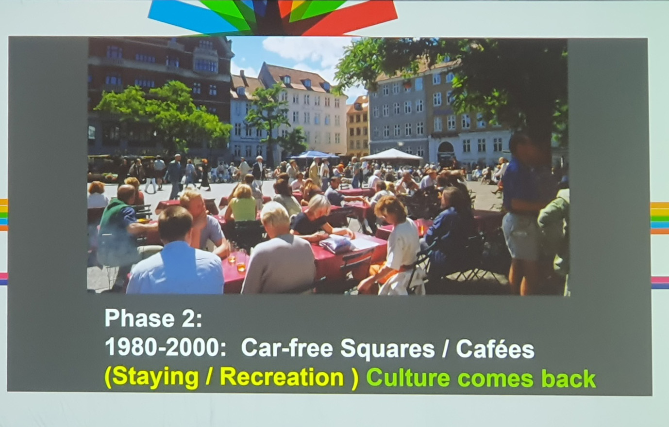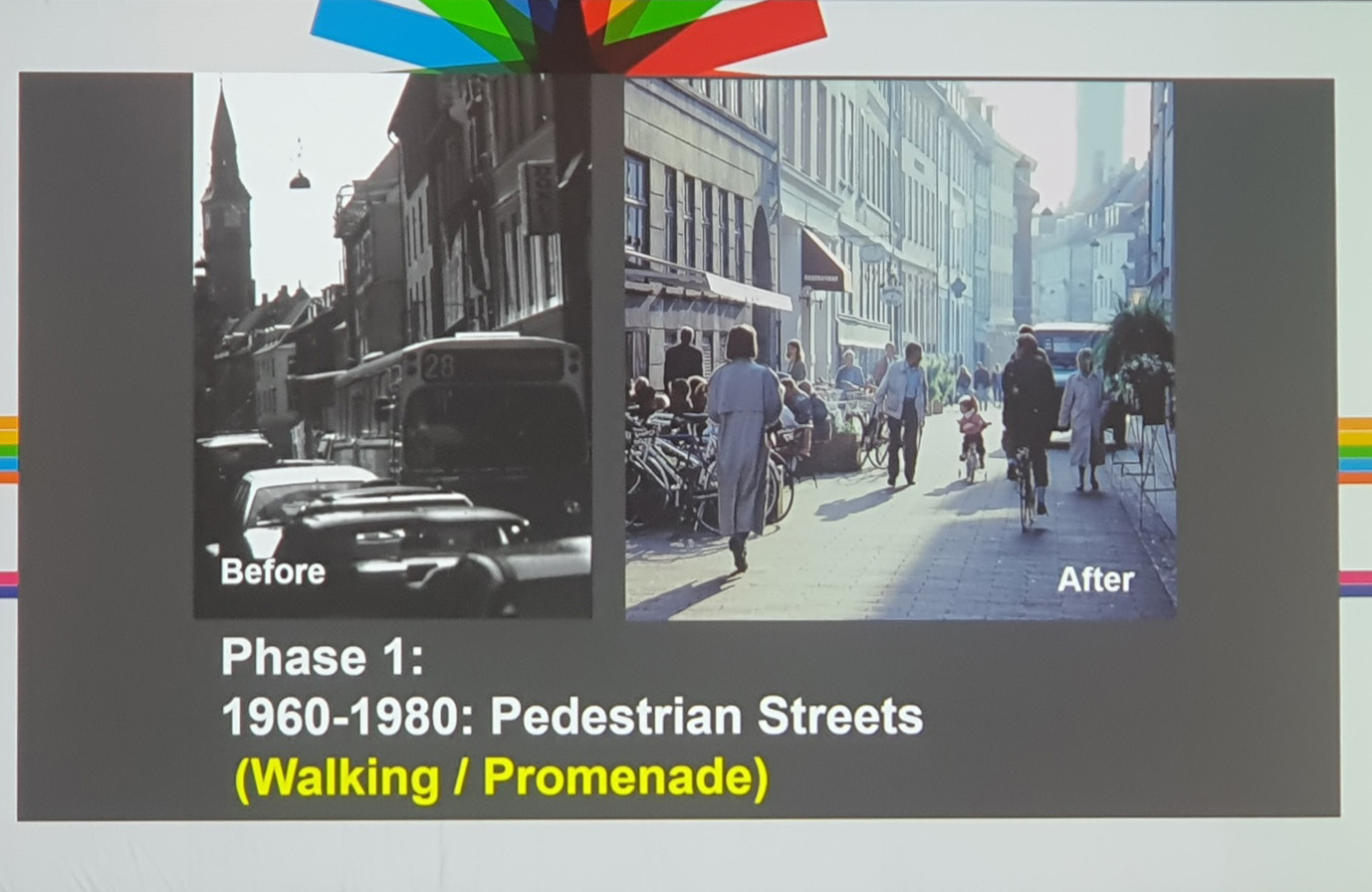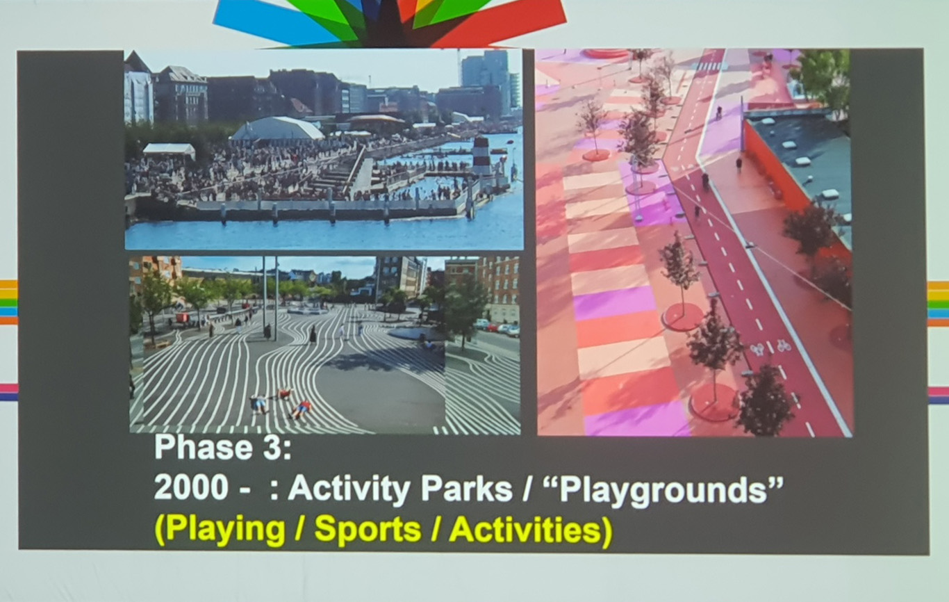 둘째 날 아침 일찍 참관한 강연은 도시설계 대부인 얀 겔(Jan Gehl)과 호주 멜번시의 시건축사인 롭 아담스(Rob Adams)의 ‘City for People - 50 Years Later’이다. 올해 한국 나이로 88세인 얀 겔은 도시설계의 대부로, 그의 강연은 개인적 출생부터 젊은 시절, 결혼 그리고 뉴욕, 버클리, 코펜하겐 3개 대학에서 도시설계를 가르치고 1971년부터 2022년까지 7권의 책을 41개국어로 출판한 이야기부터 시작한다. 얀 겔은 미국의 2개 학교에서 도시설계를 가르치고 코펜하겐으로 돌아와 작은 나라 작은 도시(Small Country-Small City)연구에 집중하기 시작한다. 1967년부터 2006년까지 코펜하겐 시와 대학이 긴밀하게 연구해 코펜하겐은 세계에서 ‘도시에서 삶에 대한 데이터가 자료화 된 최초의 도시’가 되었다. 코펜하겐 시장이었던 베넷 프로스트(Benete Frost)는 “정치인은 건축학교에서 공공의 삶에 대한 연구 없이는 감히 코펜하겐을 세계에서 가장 살만한 곳이라고 말할 수 없다”고 했다. 현재 코펜하겐은 도시구조가 차로, 자전거도로, 보행자 도로가 공존하고 그 위계도 같다. 차로 2차선, 자전거도로 2차선, 보행자도로 2차선으로 보행과 자전거 중심의 도시구조이다. 과거는 한국과 마찬가지로 차로 중심이었다고 한다. 도시에서 도로 구조의 변화는 사람들이 걷기 좋고 안전한, 즐거운 도시의 길과 공간을 만들었다. 1962년부터 2023년까지 4단계로 된 도시계획은 장시간에 걸쳐 점차적으로 진화했다. 1단계인 1960~1980기간은 보행거리 만들기로 산책과 보행을 가능하게 만들었다. 2단계인 1980~2000 기간은 자동차 없는 광장과 카페 만들기로, 도시에서 머물고 행사가 가능하게 공공공간을 만들어 도시의 문화를 회복했다. 3단계는 2000년부터로 활동적인 공원과 운동장 만들기, 4단계는 기후 적응기로 적응과 재생이 결합된 도시 만들기이다. 강연의 마지막은 자신의 이러한 노력은 자신의 손자 손녀에게도 도시에서 안전하고 걷기 좋고 즐거운 삶을 갖게 했다며 마무리한다. 마지막까지 들었을 때, 왜 강연의 처음에 자신의 삶에 대한 애기를 했는지 이해했다. 도시는 정량적 지표가 아니라 그 안에서 살고 있는 사람들, 그리고 후세를 위해 개발이 아닌 시간과 단계적 계획의 결과로 만들어지는 것이다.
