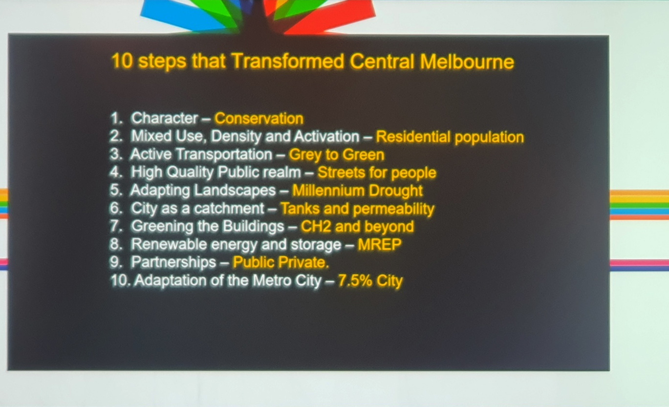 호주 멜번시의 롭 아담스는 1985년부터 멜번시청(Melbourne City)에 시건축사로 일하면서 세계에서 가장 살기 좋은 도시인 멜번시를 만들기 위해 우선 도시의 목표를 재정비하고, 이를 위한 10단계 계획의 진행 내용을 설명했다.