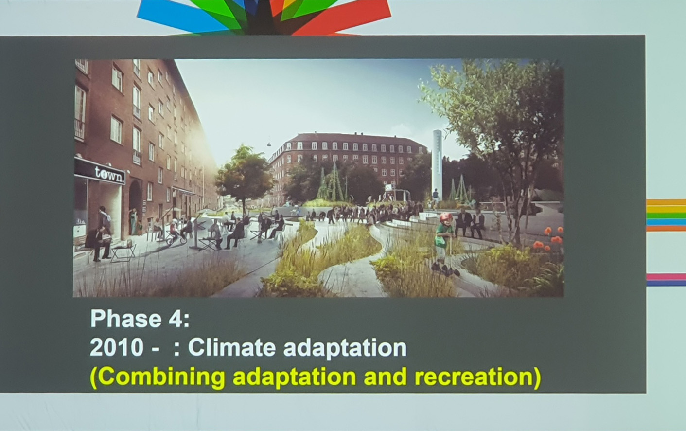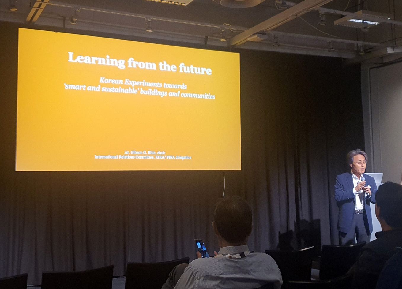 오후에는 한국수자원 공사와 덴마크 대사관 주재로 ‘The K-way to Sustainable Cities’를 주제로 한 한국의 건축사와 교수들의 강연이 있었다. 발표자 중 한 명인 카이스트(KAIST)의 김영철 교수는 도시공간을 분석해 그린하우스 가스를 줄일 수 있게 데이터를 활용한 알고리즘을 적용한 도시의 디자인 케이스를 소개하고, 도시와 기술과 건축의 협업 필요성과 중요성에 대해 강연했다. 강연에서 소개된 데이터를 활용한 도시공간분석은 실제 설계단계에서 범용화 되면 도시공간에 큰 변화를 줄 수 있다는 생각이 들었다. 두 번째 주요 강연은 이건섭 대한건축사협회 국제위원장이 삼우종합건축사사무소에서 진행한 네이버 사옥과 몽고의 마스터플랜과 공동주택설계에 대한 강연이었다. 지속가능한 설계와 국내 최초 로봇 친화 사무실인 네이버 제2사옥의 설계와 현재 사용에 대한 설명과 라이프 패턴에 따라 달라질 수 있는 몽골의 마스터 플랜, 또 기후의 영향을 고려해 변화한 공동주택의 주동 배치에 대한 내용의 강연은 SDG 17을 적용한 설계 프로젝트로 참가자들의 관심을 받았다. 천의영 한국건축가협회 회장은 ‘땅의 도시 땅의 건축’을 주제로 서울 공공건축의 변화과정과 이번 가을에 열릴 서울 비엔날레에 대해 발표했다.