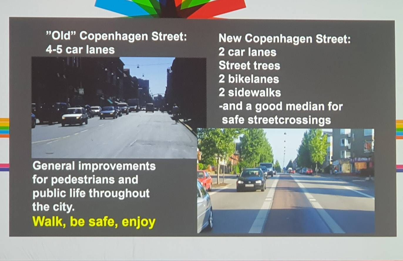 둘째 날 아침 일찍 참관한 강연은 도시설계 대부인 얀 겔(Jan Gehl)과 호주 멜번시의 시건축사인 롭 아담스(Rob Adams)의 ‘City for People - 50 Years Later’이다. 올해 한국 나이로 88세인 얀 겔은 도시설계의 대부로, 그의 강연은 개인적 출생부터 젊은 시절, 결혼 그리고 뉴욕, 버클리, 코펜하겐 3개 대학에서 도시설계를 가르치고 1971년부터 2022년까지 7권의 책을 41개국어로 출판한 이야기부터 시작한다. 얀 겔은 미국의 2개 학교에서 도시설계를 가르치고 코펜하겐으로 돌아와 작은 나라 작은 도시(Small Country-Small City)연구에 집중하기 시작한다. 1967년부터 2006년까지 코펜하겐 시와 대학이 긴밀하게 연구해 코펜하겐은 세계에서 ‘도시에서 삶에 대한 데이터가 자료화 된 최초의 도시’가 되었다. 코펜하겐 시장이었던 베넷 프로스트(Benete Frost)는 “정치인은 건축학교에서 공공의 삶에 대한 연구 없이는 감히 코펜하겐을 세계에서 가장 살만한 곳이라고 말할 수 없다”고 했다. 현재 코펜하겐은 도시구조가 차로, 자전거도로, 보행자 도로가 공존하고 그 위계도 같다. 차로 2차선, 자전거도로 2차선, 보행자도로 2차선으로 보행과 자전거 중심의 도시구조이다. 과거는 한국과 마찬가지로 차로 중심이었다고 한다. 도시에서 도로 구조의 변화는 사람들이 걷기 좋고 안전한, 즐거운 도시의 길과 공간을 만들었다. 1962년부터 2023년까지 4단계로 된 도시계획은 장시간에 걸쳐 점차적으로 진화했다. 1단계인 1960~1980기간은 보행거리 만들기로 산책과 보행을 가능하게 만들었다. 2단계인 1980~2000 기간은 자동차 없는 광장과 카페 만들기로, 도시에서 머물고 행사가 가능하게 공공공간을 만들어 도시의 문화를 회복했다. 3단계는 2000년부터로 활동적인 공원과 운동장 만들기, 4단계는 기후 적응기로 적응과 재생이 결합된 도시 만들기이다. 강연의 마지막은 자신의 이러한 노력은 자신의 손자 손녀에게도 도시에서 안전하고 걷기 좋고 즐거운 삶을 갖게 했다며 마무리한다. 마지막까지 들었을 때, 왜 강연의 처음에 자신의 삶에 대한 애기를 했는지 이해했다. 도시는 정량적 지표가 아니라 그 안에서 살고 있는 사람들, 그리고 후세를 위해 개발이 아닌 시간과 단계적 계획의 결과로 만들어지는 것이다.