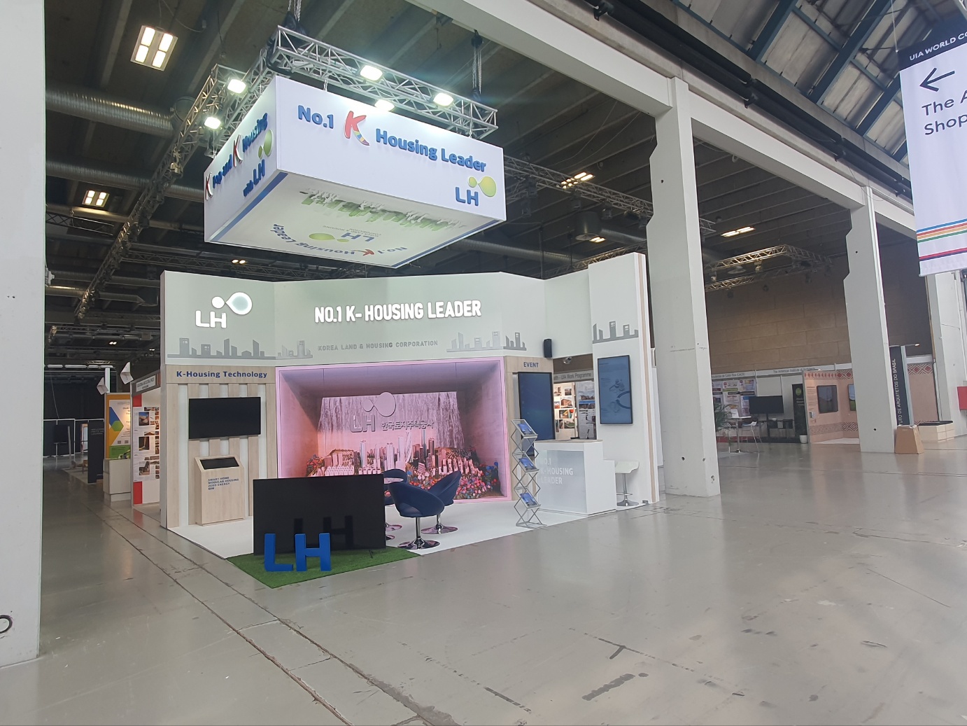 2023 UIA World Congress에는 강연뿐 아니라 각국의 도시와 건축, 그리고 대화를 할 수 있는 각 나라의 전시 부스가 마련되어 있다. 각 나라마다 최근 건축에 대한 동향과 새로운 재료와 기술을 홍보할 수 있다. 한국은 FIKA 전시관, 서울관, LH 전시관 등 3개의 전시관이 설치되었다. 전시관 곳곳에는 친교와 정보교환을 할 수 있는 카페가 있고, 옛날 사과상자 디자인의 카페 선반들은 최소의 제조 공정으로 만들어져 친환경적 이미지를 나타낸다. 불필요한 것에 많은 시간과 자원을 투자하지 않는 것도 친환경적 디자인의 하나의 방법으로 보인다.