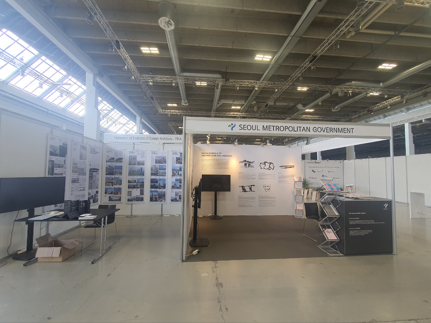 2023 UIA World Congress에는 강연뿐 아니라 각국의 도시와 건축, 그리고 대화를 할 수 있는 각 나라의 전시 부스가 마련되어 있다. 각 나라마다 최근 건축에 대한 동향과 새로운 재료와 기술을 홍보할 수 있다. 한국은 FIKA 전시관, 서울관, LH 전시관 등 3개의 전시관이 설치되었다. 전시관 곳곳에는 친교와 정보교환을 할 수 있는 카페가 있고, 옛날 사과상자 디자인의 카페 선반들은 최소의 제조 공정으로 만들어져 친환경적 이미지를 나타낸다. 불필요한 것에 많은 시간과 자원을 투자하지 않는 것도 친환경적 디자인의 하나의 방법으로 보인다.