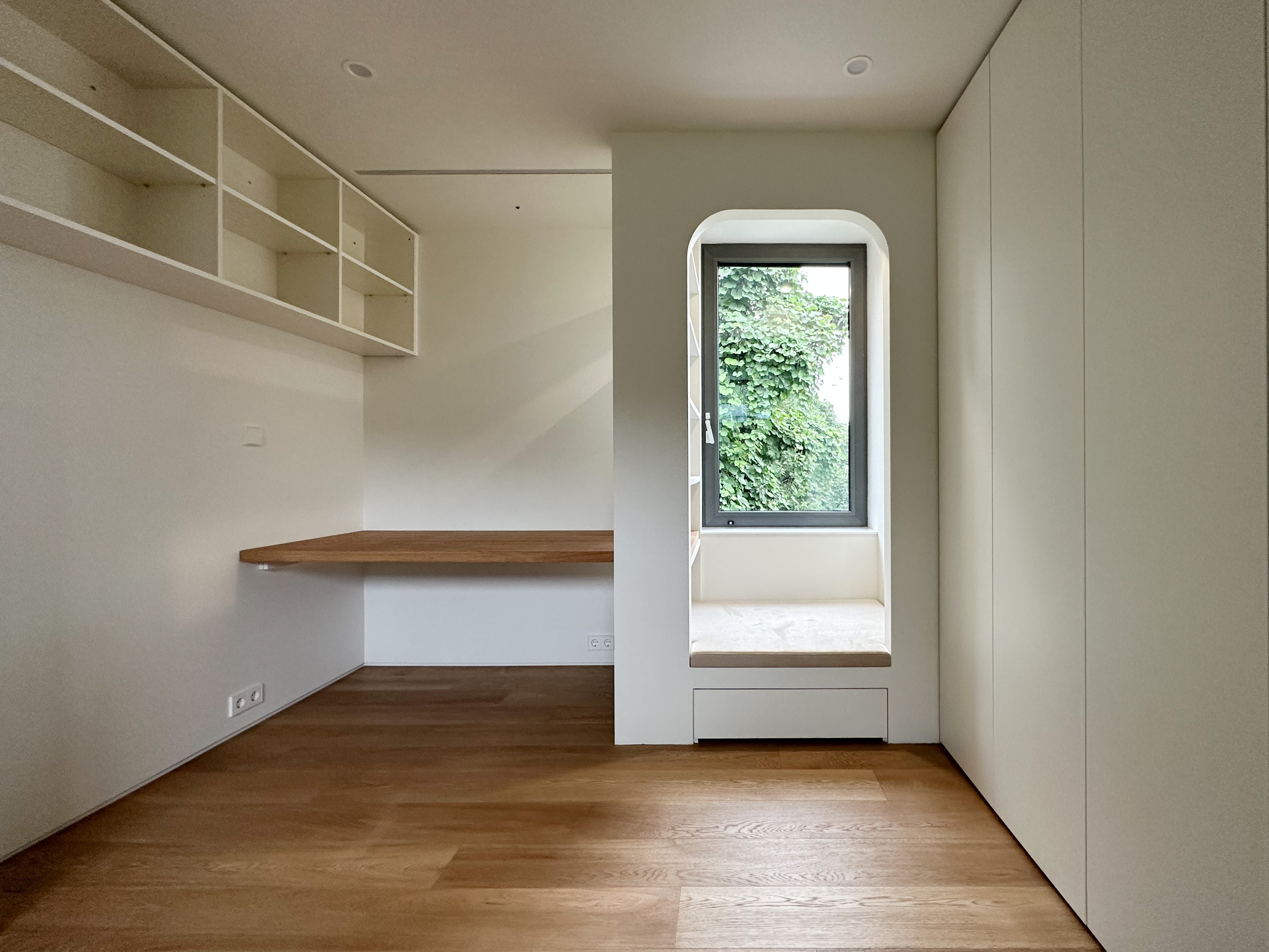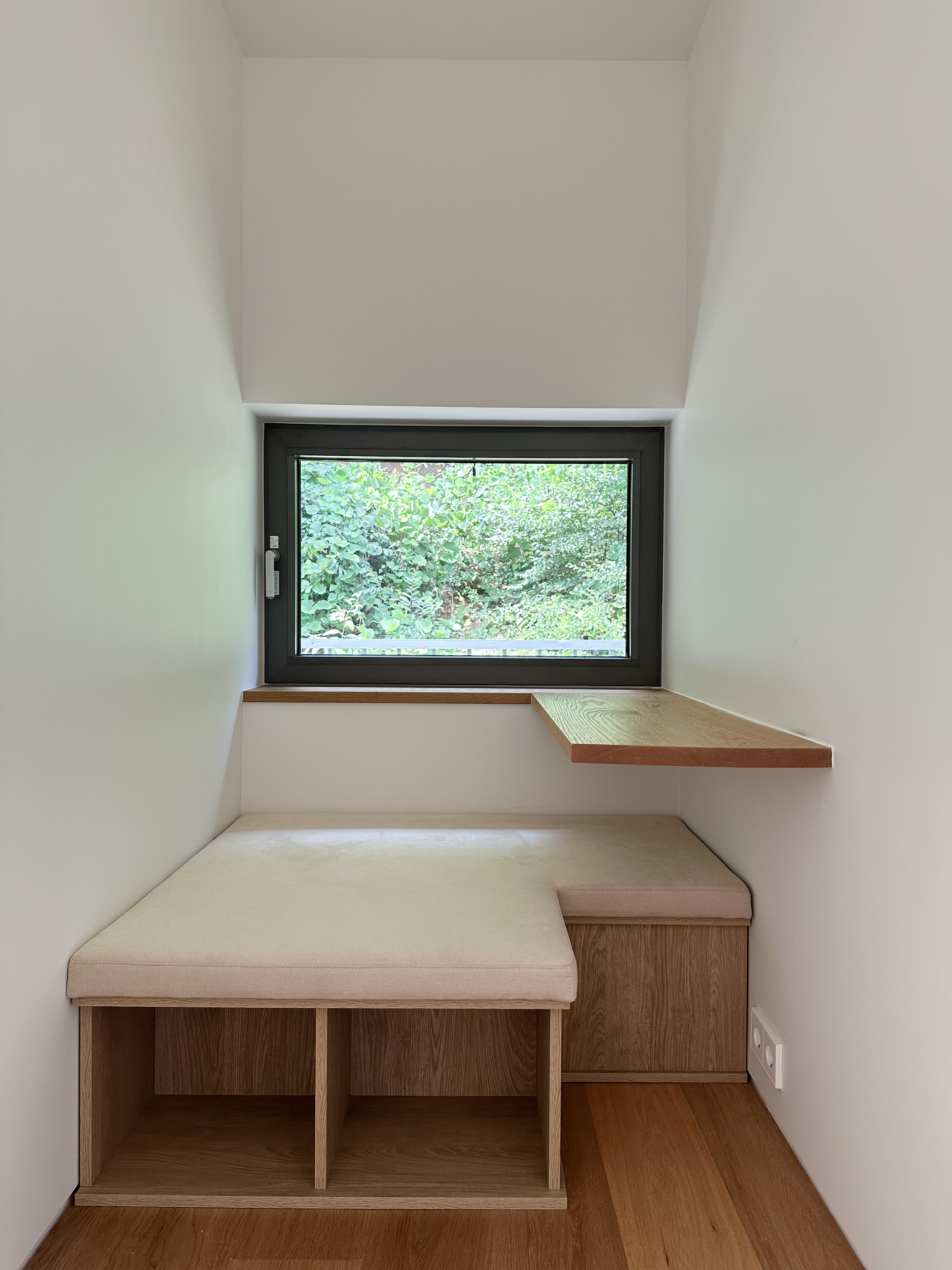 내부 공간과 관련해 이 집에서 중요한 요소 중 하나는 리딩누크다. 아내는 안방에 혼자 책 읽을 공간(리딩누크)을 필요로 했다. 리딩누크는 두 다리를 뻗고 기대어 책을 읽을 수 있으면서도 양반다리로 책을 읽을 수 있는 너비에, 불을 켜고 책을 읽을 때도 안방에서는 수면에 영향을 받지 않기를 원했다. 그래서 안방 문을 열었을 때 침대가 바로 보이지 않고 ‘윈도우픽처’가 보이는 작은 공간이 먼저 드러나도록 계획했다. 방문이 열려있을 때도 방이 들여다보이는 것이 아니라 복도에서 액자와 같은 창으로 계절이 보이게 된다. 이 리딩누크는 2층 자녀방에도 적용되었는데, 계획 진행 중에 자녀가 안방의 리딩누크를 보고 자신도 그런 공간을 가지고 싶다고 하여 자녀방 구성을 새롭게 한 부분이다. 곧 사춘기가 되는 자녀에게 아지트 같은 공간은 어찌 보면 필수이지 않을까?