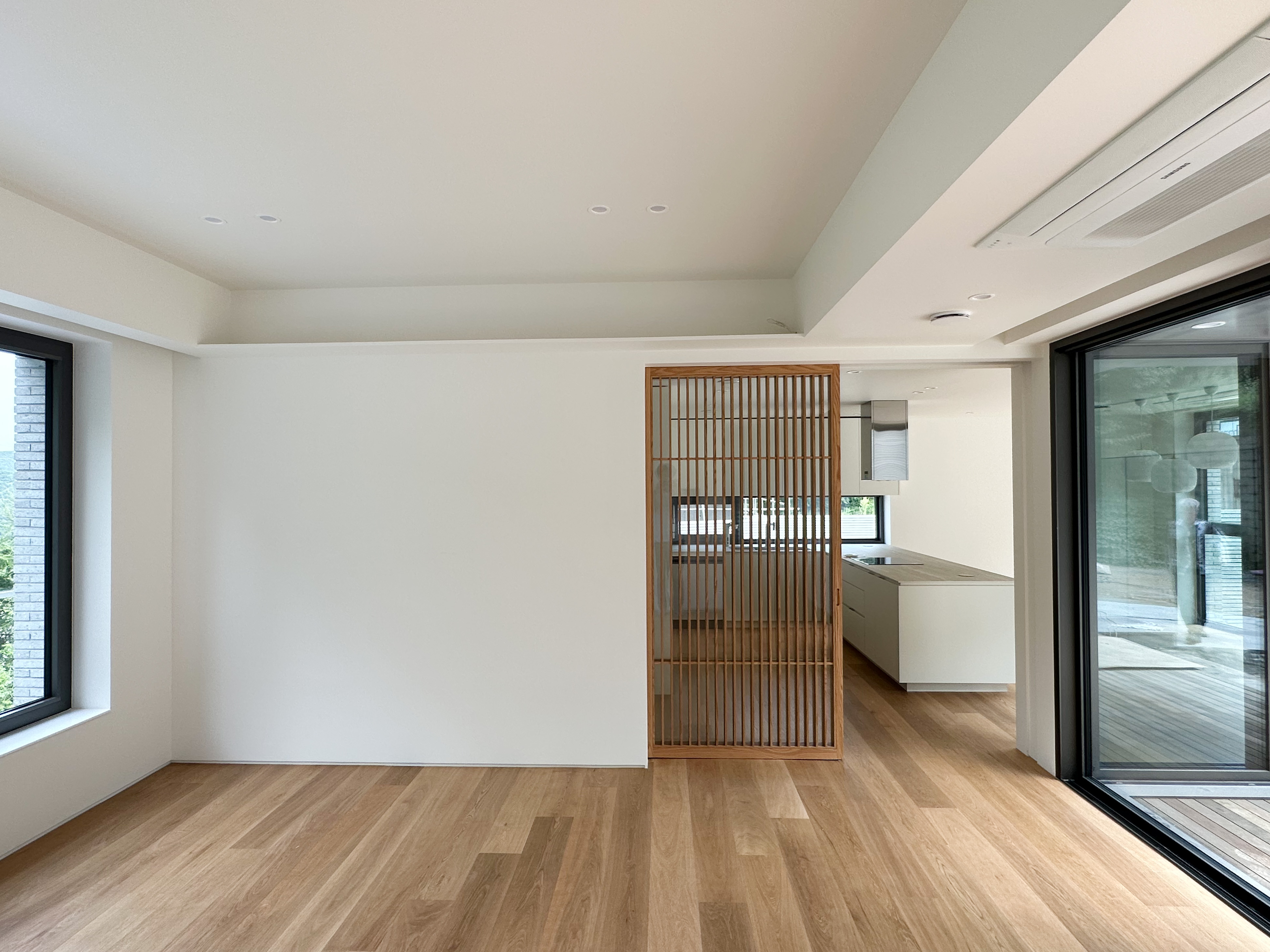 주택의 중심공간은 일반적으로 거실이다. 그러나 이 집의 거실 이야기를 비교적 나중에 하게 된 것은 이 집에서 시간을 보내는 구성원들이 중요하게 생각하고 많은 시간을 보내고자 하는 공간이 따로 있었기 때문이다. 그럼에도 불구하고 가족이 ‘함께’ 하는 공간이므로 중요하다. 이 집의 거실은 처음 설계를 시작하면서 중요하게 생각했던 남쪽의 채광과 북쪽의 뷰를 모두 만족하는 공용 공간이다. 이 대지의 북쪽은 낮아지는 경사면의 산지라 멀리 대장동까지 보이는 탁 트인 뷰가 강점이다. 그래서 대부분의 실들은 프라이버시를 위해 남쪽엔 채광창을 고창으로 계획하고, 북쪽으로는 개방감을 느낄 수 있는 큰 창들을 계획했으나 거실은 남쪽의 개인 정원과 북쪽의 원경을 통창을 통해 모두 누릴 수 있도록 개방했다. 이곳에서는 음악 감상을 좋아하는 건축주와 가족들이 화목하게 쉼을 얻고 힐링할 수 있기를 바라는 마음이 담겨있다.