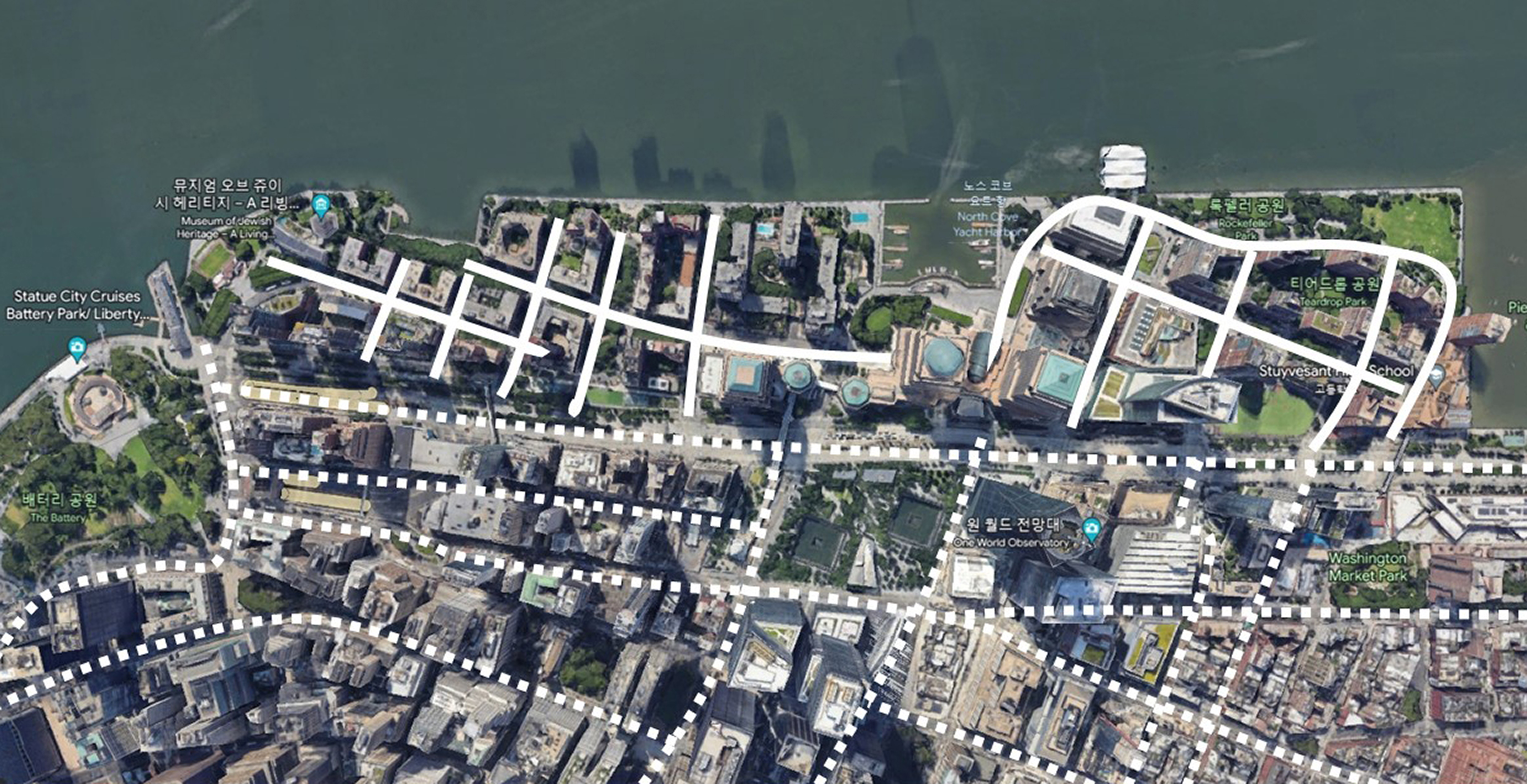 문제 해결을 위한 대안과 모델은 이미 충분하다. 1960년대부터 지금까지 지속적으로 개발되고 있는 맨해튼의 남부 재개발 지역인 배터리 파크 시티가 대표적이다. 맨해튼의 부촌 중 하나인 거주지역으로, 우리나라식 고층 아파트가 즐비하며 인접한 월가 금융맨 등 고소득자들이 많이 사는 곳이다. 집값이 비싼 거야 말할 것도 없다. 흥미로운 점은 배터리 파크 지역을 누구나 지나갈 수 있다는 점이다. 어느 나라건 고소득자들은 안전에 가장 신경을 많이 쓴다. 월가 맞은편의 이 지역은 오래된 항구산업 지역이었고, 맨해튼의 초고층 마천루의 지하 굴토로 나온 흙 등으로 매립된 지역이다. 이 지역 역시 동일 유형의 대단지 시설로도 고려되었지만, 이들은 매우 다양하고 개방된 여러 건물로 구성된 도시의 부분으로 건축을 유도했다. 디자인 코드를 만들고 건축사들의 다양한 아이디어가 섞인 개별 주거 건축들이 들어섰다. 맨해튼의 일부로 ‘열린 블록’인 배터리 파크 시티는 약 30여 개의 독립된 주거동으로 시저 펠리를 비롯한 당대의 건축사들이 설계했다.<사진 5>