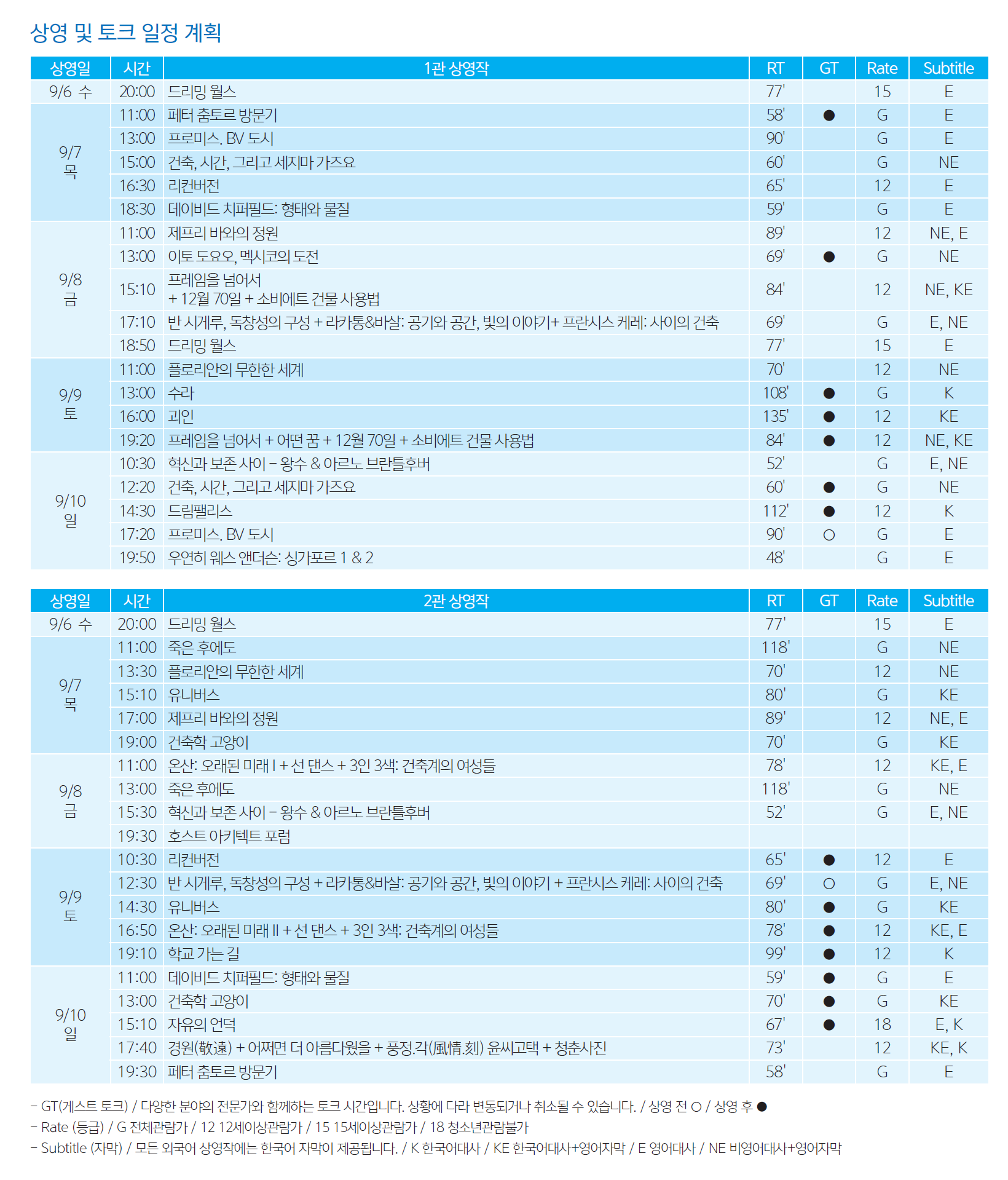 국내 또는 아시아에서 최초 선보이는 14편의 작품을 포함해 총 18개국 34편(장편 15, 단편 19)의 건축영화를 선보일 예정이며, 9월 6일부터 10일까지는 이화여대 ECC 내 아트하우스 모모에서, 10일부터 17일까지는 네이버TV 서울국제건축영화제 공식 채널에서 다양한 건축 영화를 만나볼 수 있다.