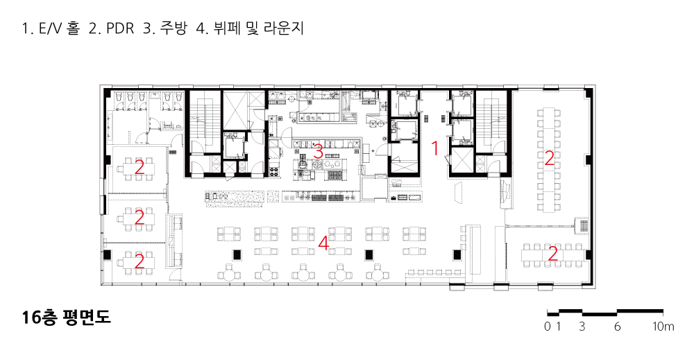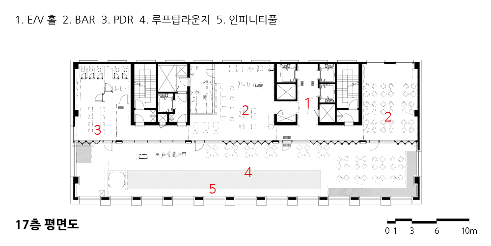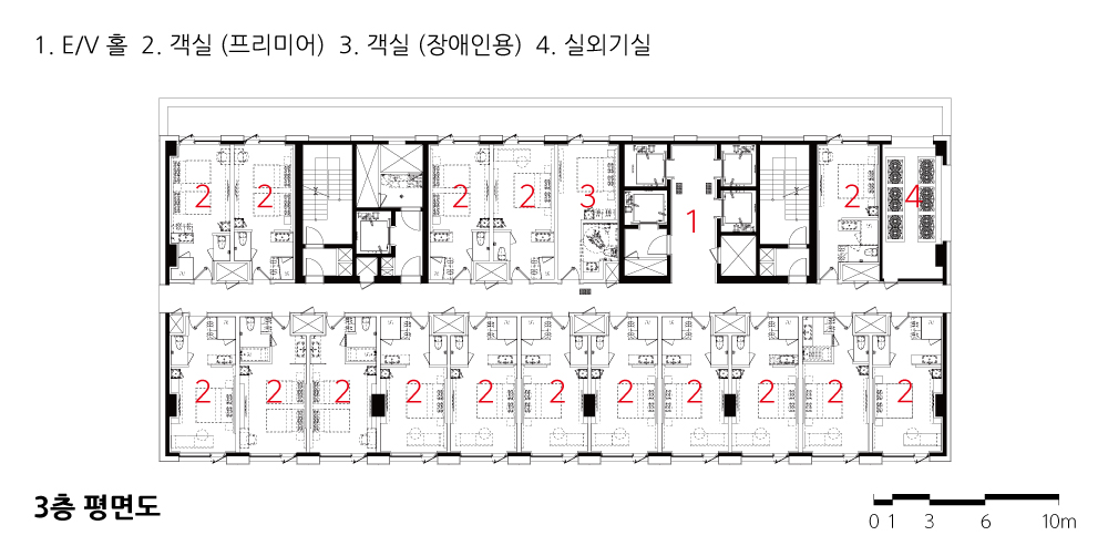 저층부는 카페와 전시공간, 로비 등 공용공간으로 구성해 내·외부 공간의 연계성을 극대화하고자 했다. 3층부터 15층에는 객실을 계획했으며, 그 중 14, 15층은 트인 시내 전망을 가진 프리미엄 객실로 구성되어 있다. 16층부터 18층은 뷔페, 라운지바, 루프탑 라운지, 수영장 등 각종 부대시설을 배치했으며, 전면 커튼월을 통해 파노라마뷰를 확보하여 차별화된 공간으로 계획했다.