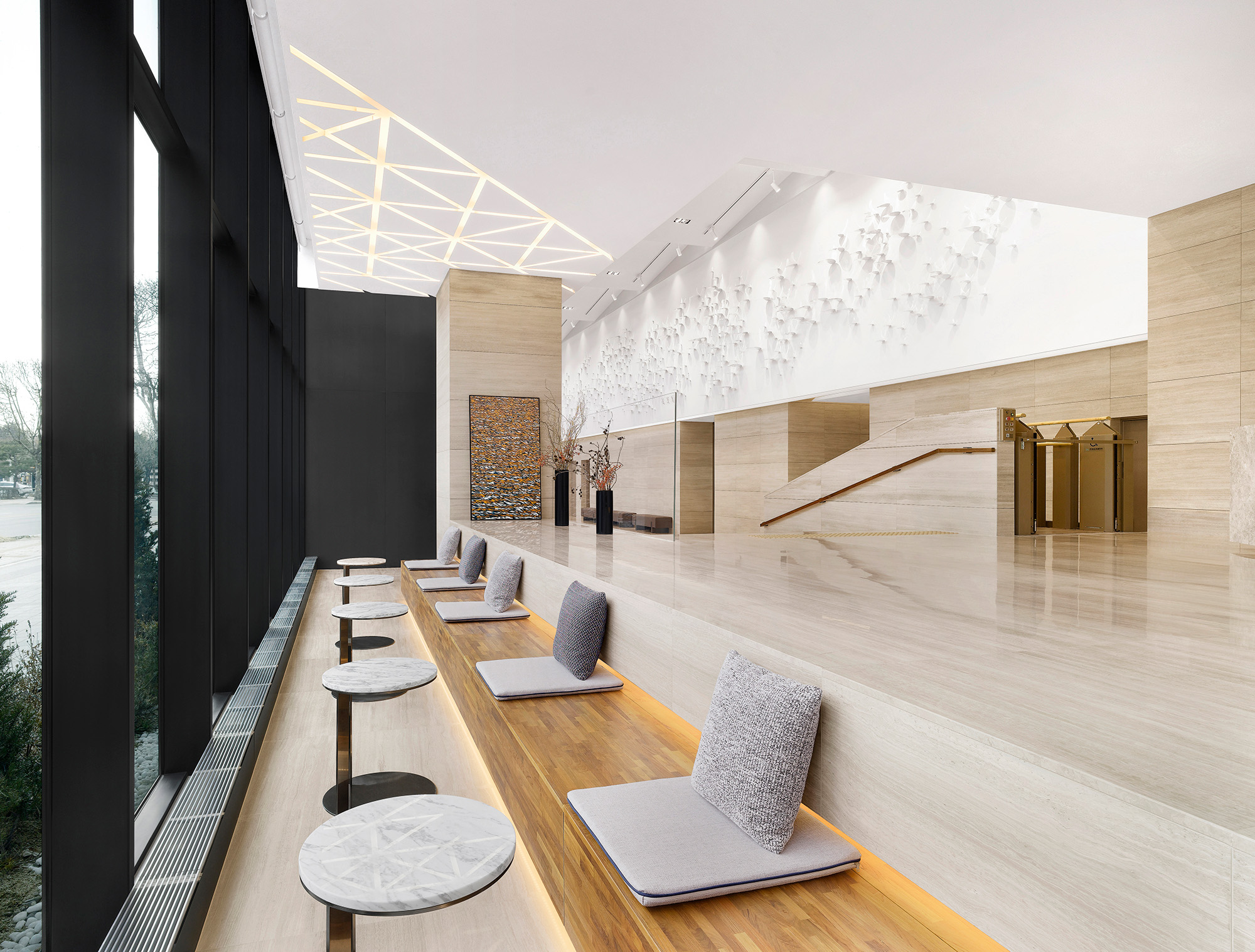 The upper floors house additional amenities, forming a collection of special programs within the hotel that create a sense of anticipation for guests. To achieve an exterior that shines like a jewel, hidden curtain walls and a surrounding frame (WEAVING) were employed. Additionally, landscape lighting was incorporated to create distinctiveness and set the main facade apart.