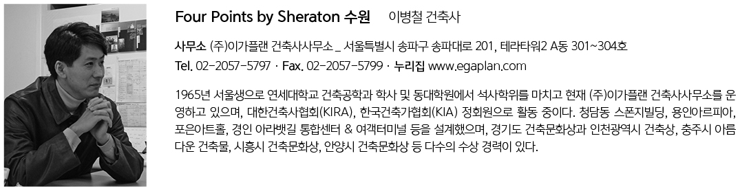 | Four Points by Sheraton 수원 설계자 | 이병철 _ (주)이가플랜 건축사사무소 건축주 | (유)성문더플레이스 감리자 | (주)전인씨엠건축사사무소 시공사 | 삼부토건(주) 설계팀 | 황병구, 양영옥, 임수지, 이은승, 이진영, 정재이, 오윤식 대지위치 | 경기도 수원시 팔달구 효원로307번길 27 주요용도 | 숙박시설(관광호텔) / 제2종근린생활시설 대지면적 | 1,326.80㎡ 건축면적 | 796.05㎡ 연면적 | 15,747.09㎡ 건폐율 | 59.99% 용적률 | 793.52% 규모 | B5F - 18F 구조 | 철근콘크리트구조 외부마감재 | 사비석 브러쉬마감, 신마천석 혼드마감, 로이복층유리, 저철분유리 내부마감재 | 대리석 물갈기마감, 브러쉬마감, 컬러스테인리스 강판, 친환경 수성페인트, 무늬목 설계기간 | 2016. 12 - 2020. 12 공사기간 | 2019. 01 - 2022. 02 사진 | 전택수 구조분야 | (주)승구조기술사사무소 기계설비분야 | (주)청우이엔지 전기분야 | (주)유원이앤씨 소방분야 | 기계소방 _ (주)청우이엔지 / 전기소방 _ (주)유원이앤씨 토목분야 | (주)아남이엔지 조경분야 | (주)솔토조경 |