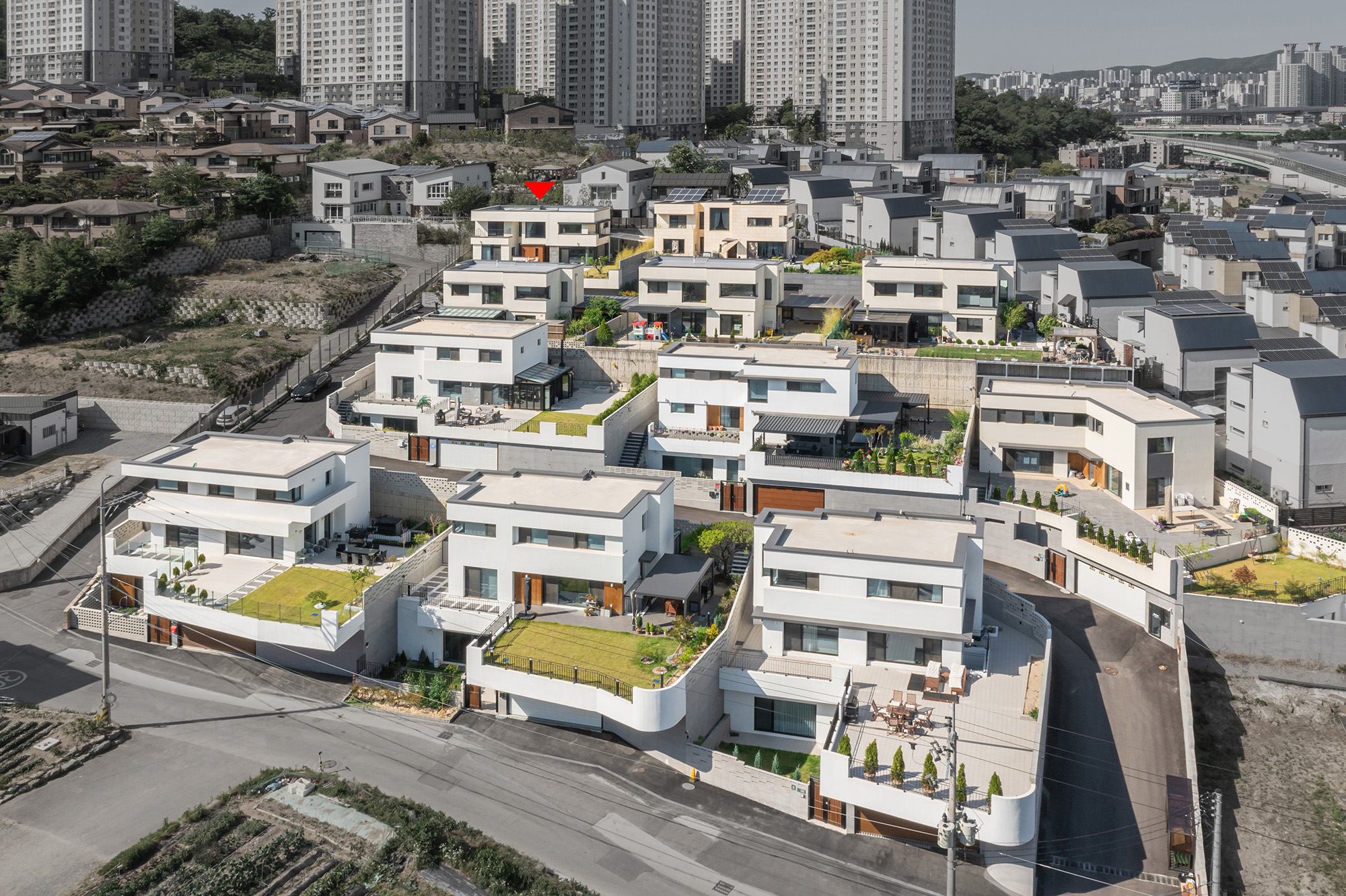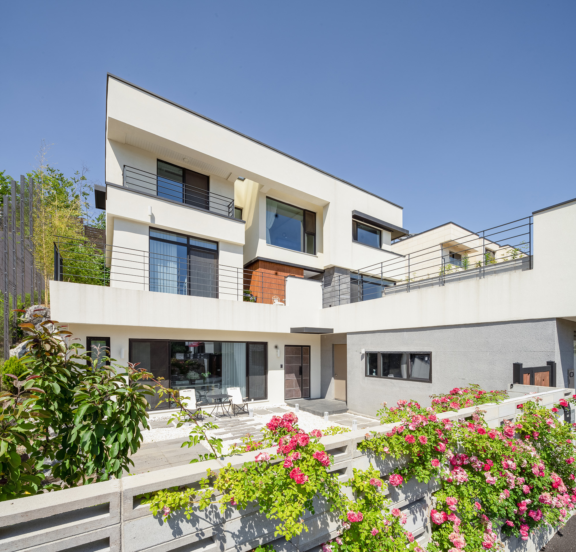 With the goal of establishing a bright and pleasant living environment in harmony with the green nature, the majority of the houses feature a simple appearance based on a white-colored minimalistic style. Using three-dimensional design elements and materials in the form of rectangular boxes, the architecture presents intriguing volumes and focal points. To enhance the sense of stability, horizontal windows extending along the length and the separation of masses resembling similar proportions were applied. From a distance, it appears as a unified village, but up close, one can observe that each house has been individually designed to meet the occupants' needs.