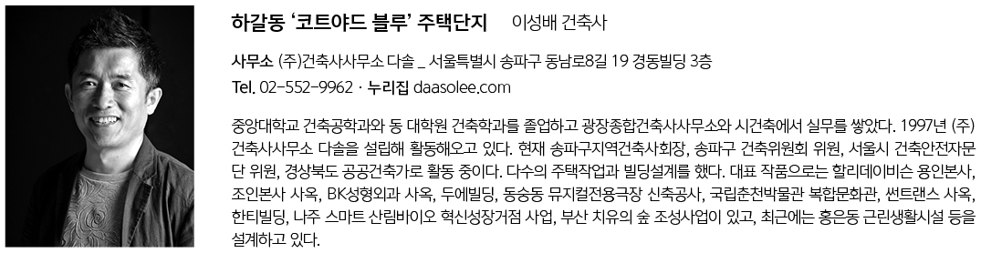 | 하갈동 ‘코트야드 블루’ 주택단지 설계자 | 이성배 _ (주)건축사사무소 다솔 건축주 | (주)블루홈씨앤디 감리자 | 이성배 _ (주)건축사사무소 다솔 시공사 | (주)블루홈씨앤디 대지위치 | 경기도 용인시 기흥구 덕영대로 1967번길 20-7 주요용도 | 단독주택 대지면적 | 446.00㎡ 건축면적 | 88.70㎡ 연면적 | 351.09㎡ 건폐율 | 19.89% 용적률 | 37.55% 규모 | B1F - 2F 구조 | 철근콘크리트구조 외부마감재 | 탄화목재 루버, 스타코, 화산석 내부마감재 | 강화마루, 친환경페인트, 포세린타일, 강마루 설계기간 | 2016. 11 - 2020. 03 공사기간 | 2020. 09 - 2021. 10 사진 | 정우철 구조분야 | BASE구조기술사사무소 기계설비분야 | 선화설비 전기분야 | 선화설비 소방분야 | 선화설비 |