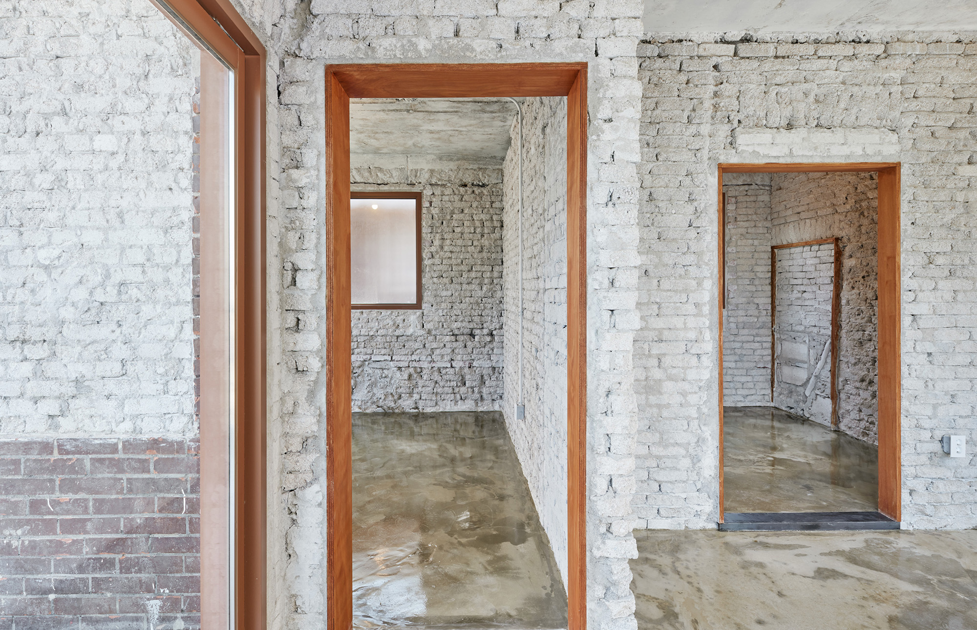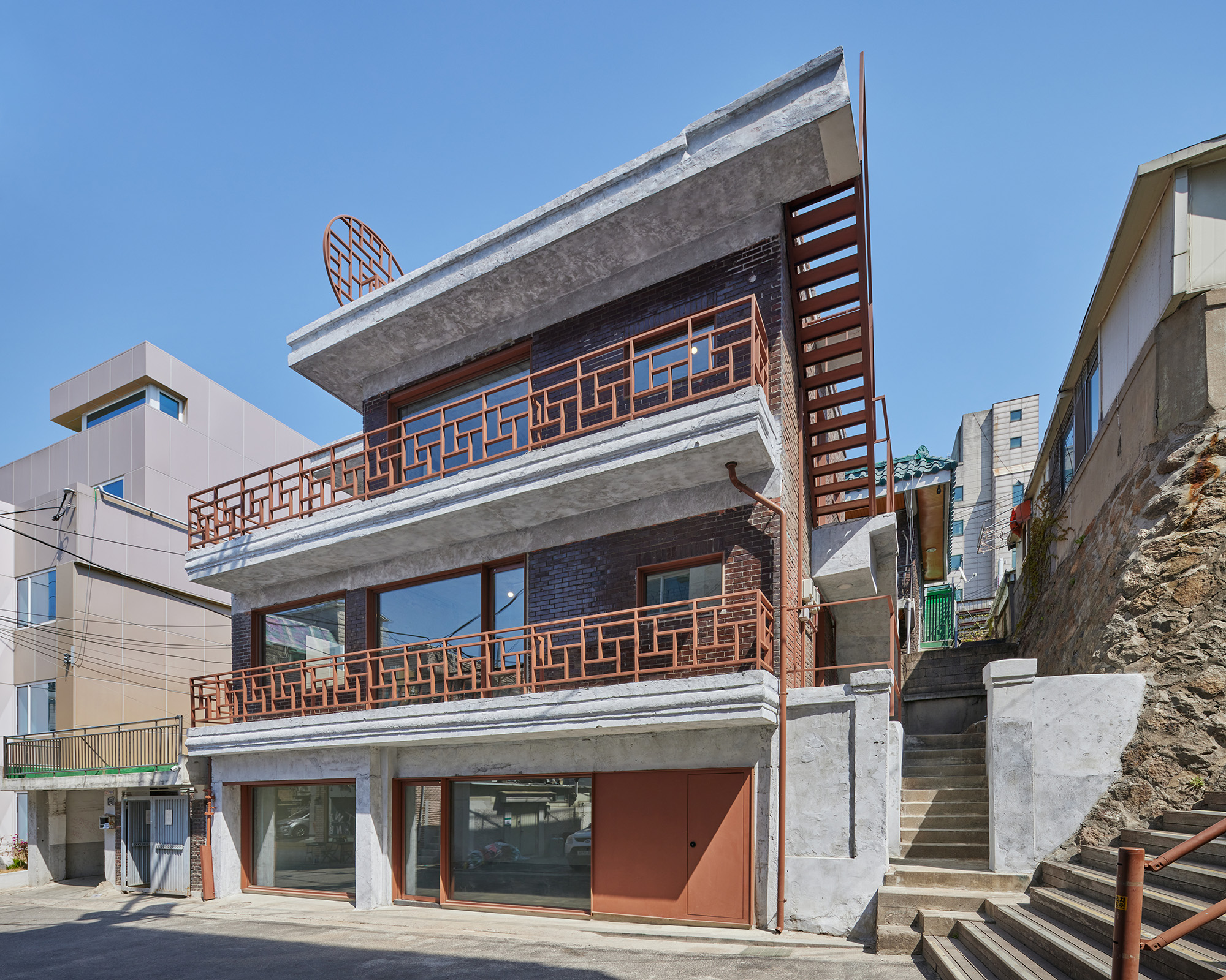 내외부 벽체는 박피를 하듯 마감과 미장, 칠들을 걷어내며 오롯이 공간을 구성하는 날것의 물성을 드러내어 공간이 변모했던 흔적, 혹은 유적과 같은 층위를 마감의 요소로 차용했다. 기존의 외부 철제 난간은 해체와 재구성을 통해 막다른 골목길의 새로운 풍경을 만들어냈다.