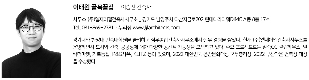 이태원 골목끝집 설계자 | 이승진_ (주)엘제이엘건축사사무소 김원방 _ (주)퍼스펙티브스건축사사무소 건축주 | (주)코너스톤브릿지 시공사 | 박종화 설계의도 구현 | (주)엘제이엘건축사사무소, (주)퍼스펙티브스건축사사무소 대지위치 | 서울특별시 용산구 보광로60길 14-13 주요용도 | 근린생활시설 대지면적 | 99.80㎡ 건축면적 | 55.80㎡ 연면적 | 158.08㎡ 건폐율 | 55.92% 용적률 | 102.49% 규모 | B1F - 2F 구조 | 연와조 외부마감재 | 치장벽돌보수, 콘크리트면정리 내부마감재 | 시멘트벽돌노출 설계기간 | 2022. 11 - 2023. 01 공사기간 | 2023. 01 - 2023. 04 사진 | 노경 구조분야 : (주)이든구조컨설턴트 기계설비분야 | 진흥이엔지 전기분야 | 진흥이엔지 |