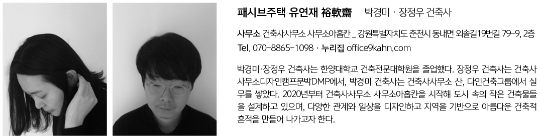 | 유연재 裕軟齋 설계자 | 박경미 · 장정우 _ 건축사사무소 사무소아홉칸 건축주 | 이종환 시공사 | 빌드앤픽스 설계의도 구현 | 건축사사무소 사무소아홉칸 대지위치 | 경기도 양평군 공흥리 주요용도 | 단독주택 대지면적 | 271.00㎡ 건축면적 | 94.63㎡ 연면적 | 142.82㎡ 건폐율 | 34.92% 용적률 | 52.70% 규모 | 2F 구조 | 경량목구조 외부마감재 | 벽돌타일, 컬러강판 (외벽_우성벽돌타일 슬림그레이, T0.5컬러강판 / 지붕_T0.5컬러강판 돌출이음) 내부마감재 | 석고보드 위 수성페인트, 원목마루, 타일 (벽_벤자민무어 친환경 도장, 에덴바이오 벽지, 템바보드(오크) / 바닥_노바강마루 블랑오크) 설계기간 | 2021. 07 – 2022. 01 공사기간 | 2022. 02 – 2022. 08 사진 | 노경 구조분야 | (주)인터이앤씨 기계설비분야 | (주)건창기술단 전기/통신분야 | (주)성진티이씨 인증 | 한국패시브협회 인증주택 (4.0L/㎡a) |