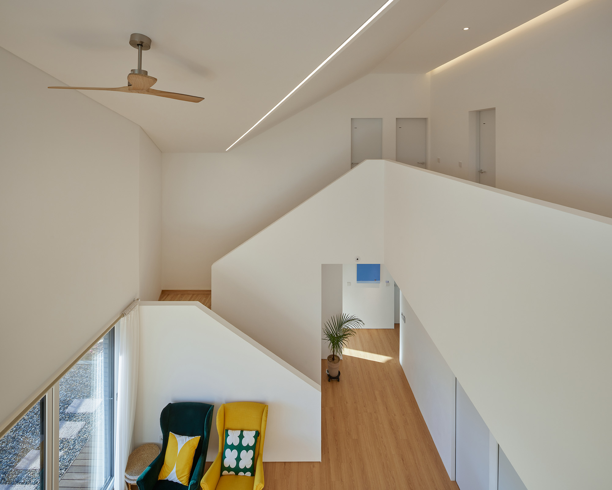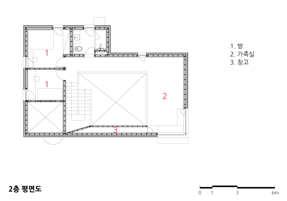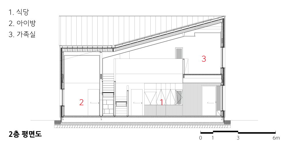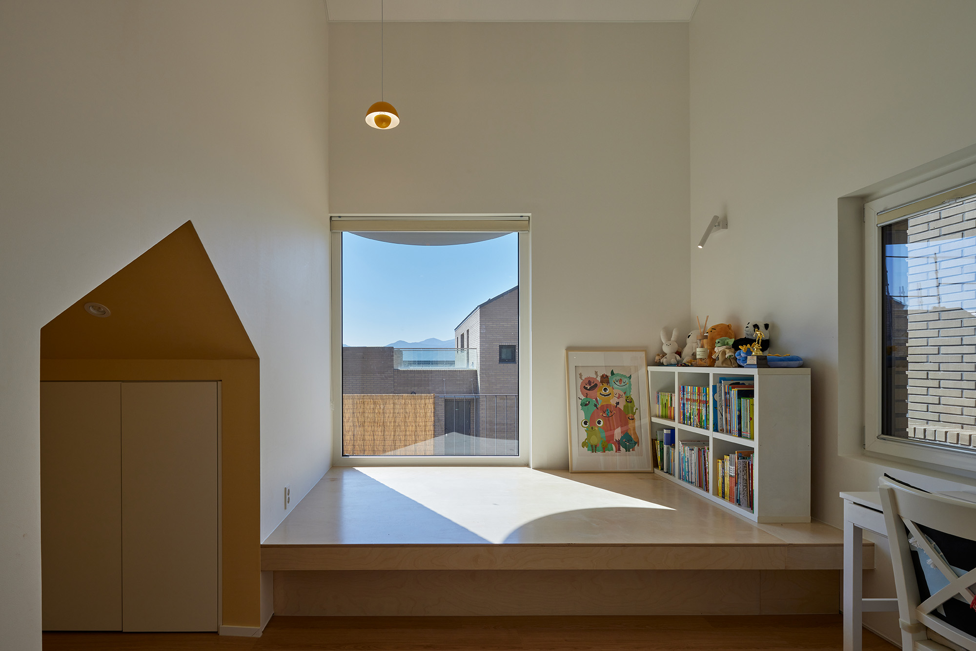 아이방 역시 1층의 남측 영역에 배치해 마당과 채광을 잘 누릴 수 있도록 했다. 아지트로 쓸 수 있는 자작나무 평상과 벙커 스페이스를 만들어 기억이 아이에게 오래 남는 장소가 되길 바랐다. 2층은 마을 풍경을 즐길 수 있는 남측에 가족실을 두고, 부부의 침실은 프라이버시와 숙면을 고려해 각각 안쪽에 두었다.