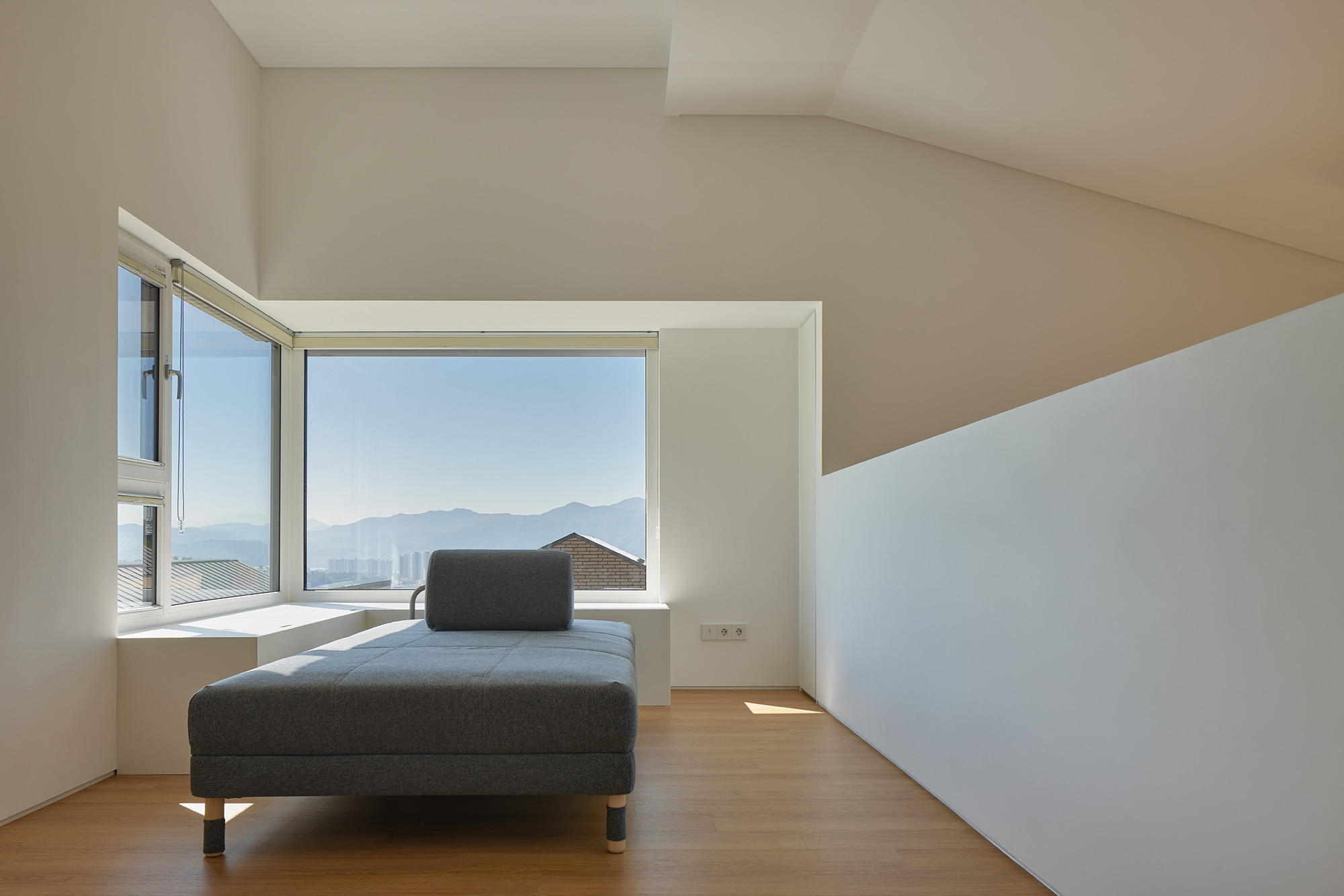 The site was located between Yongmun Mountain and the Namhan River, with a gentle slope facing the southeast in the middle of the housing complex. The house provided a view of the village landscape from its southern facing side. While the housing complex adhered to a carefully planned masterplan, where all neighboring houses utilized the same external finish to maintain a consistent tone and character, the couple chose to prioritize the interior space layout and required functions over the outward appearance. The rational design of the spaces naturally influenced the overall form of the house, aiming to create a residence that could add a touch of flexibility to the village's landscape.
