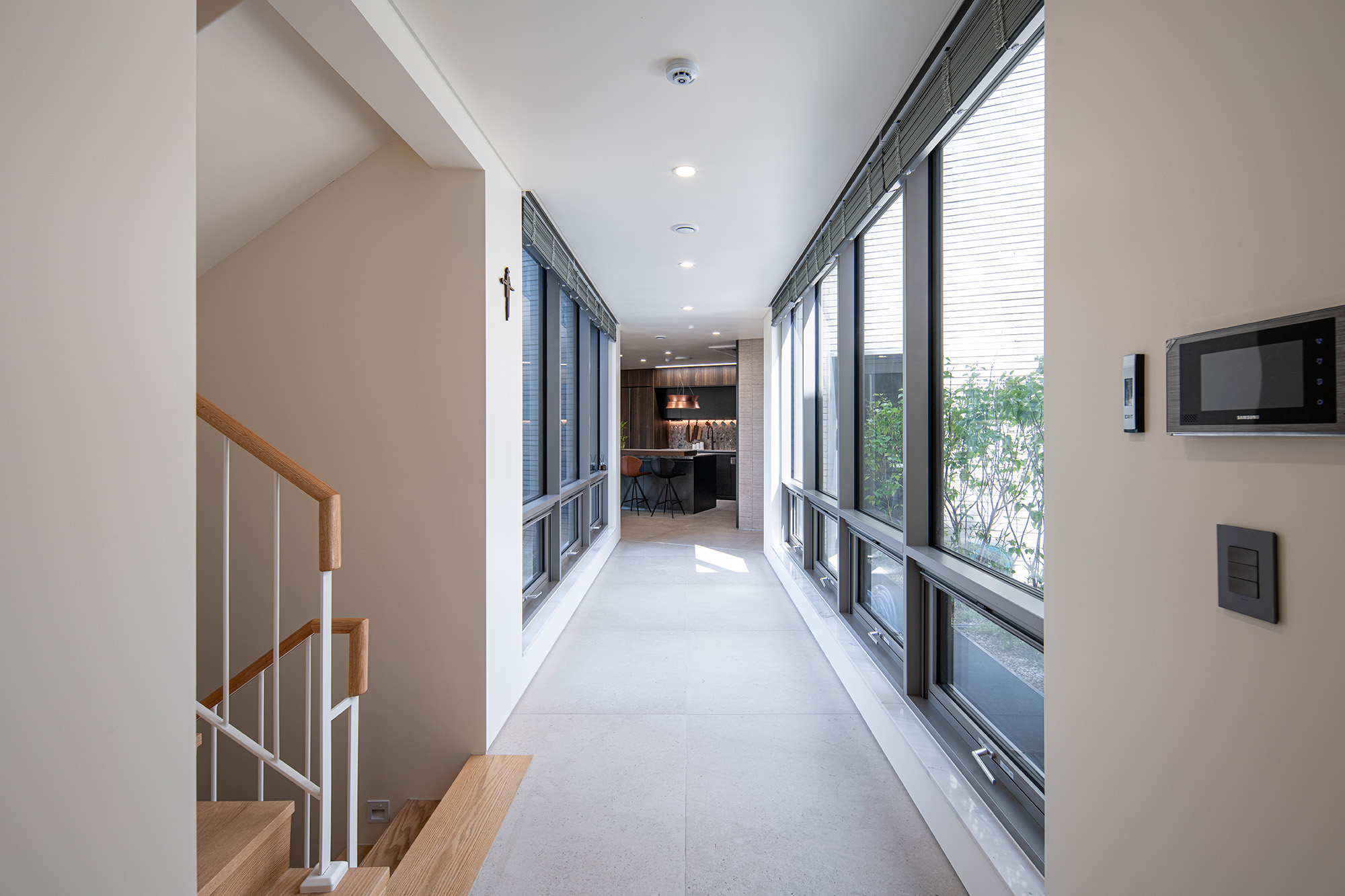 Considering the north-south axis of the land, I initially pondered how to address the sightline along the road on the south side and how to manage the direct sunlight. The design process began with the question, "What choices should be made to preserve the privacy of a house facing the road?" Given the requirement for brick as the external material, there were numerous considerations for the massing. As the mass started to take shape and the functional layout of the plan was solidified, I gradually connected each step of the process and fine-tuned the details while creating spaces. Since it's a residence, I focused on the living room, envisioning a space where the family could gather. Elevating the central living area slightly resolved height concerns, and to address the gaze from the road, I introduced a louver-like open space through a wall treatment that diffuses natural light. Initially, the client found it difficult to understand the solution for the road-side views, but after the building was completed, they were quite satisfied. Alongside the important living room, the view of the Han River's reed bed through the curtain wall along the corridor created a uniquely charming space that invites one to stand and gaze for a moment. I would like to conclude this story with "In a house resembling an art gallery, the family lived happily for a long time."