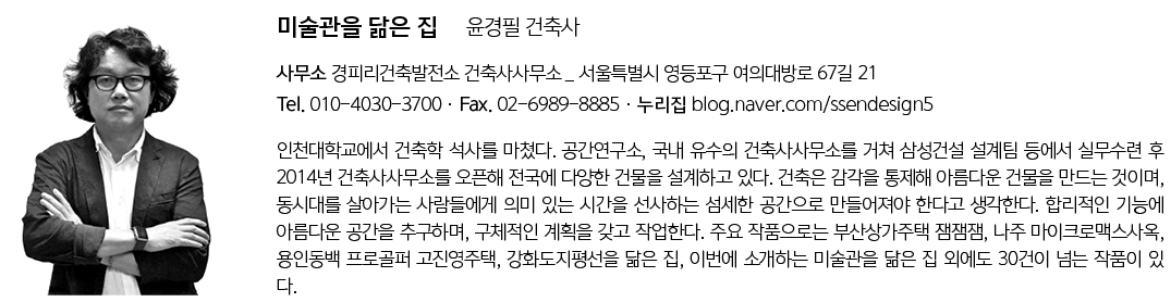 | 미술관을 닮은 집 설계자 | 윤경필 _ 경피리건축발전소 건축사사무소 건축주 | 최정훈, 인영실 감리자 | 경피리건축발전소 건축사사무소 시공사 | 성도산업개발(주) 설계팀 | 이은영, 윤유리 설계의도 구현 | 경피리건축발전소 건축사사무소 대지위치 | 경기도 김포시 생태공원길 74-19 주요용도 | 단독주택 대지면적 | 392.90㎡ 건축면적 | 188.61㎡ 연면적 | 424.85㎡ 건폐율 | 48.00% 용적률 | 77.26% 규모 | B1F - 2F 구조 | 철근콘크리트구조 외부마감재 | 이태리수입벽돌 내부마감재 | 친환경페인트, 석고보드 설계기간 | 2021. 02 - 2021. 07 공사기간 | 2021. 08 - 2022. 08 사진 | #f64_archiphoto 구조분야 | (주)더원구조이앤씨 기계설비분야 | (주)건양엠이씨 전기분야 | (주)천일엠이씨 소방분야 | (주)천일엠이씨 |