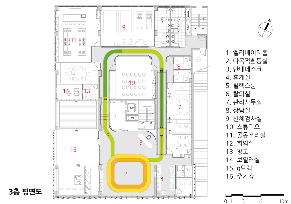Among the three programs, the kitchen for dietary therapy and the physical examination space have gradually taken shape, adapting to the changing number of users and the size of examination equipment. In contrast, the exercise program was designed from the outset to overcome the constraints of limited space and be used in a versatile manner. Firstly, the walking program was designed to streamline the entire corridor, allowing for a total walking distance of about 70 meters. The lobby was equipped with red-slings, allowing exercise while enjoying the view of Seonjeongneung, and the multipurpose room was designed to accommodate not only seminars but also activities like yoga.