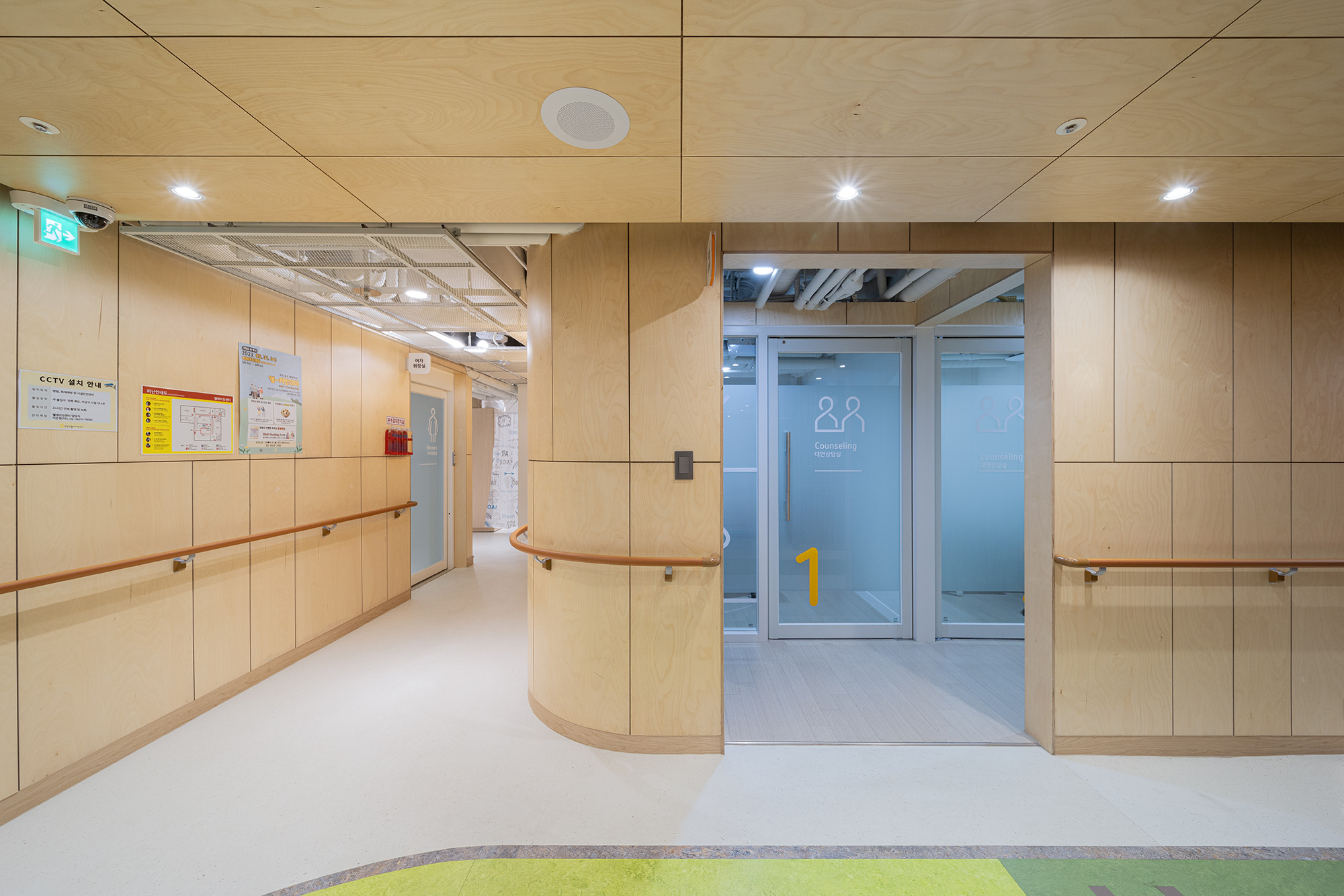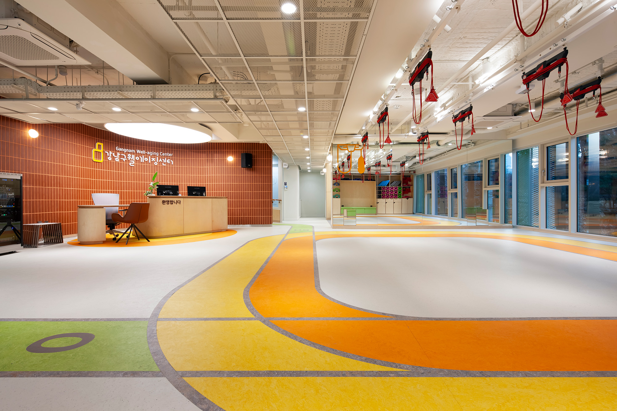 또 다른 도전은 층고와 규모가 제한된 낡은 주차장 건물이 대상지였다는 것이다. 대상지는 지은 지 20년 된 주차장 건물로서, 추후 주차장 상부에 강남구 치매안심센터가 증축된 건물이었다. 웰에이징센터를 이곳에 마련하게 된 까닭도 치매안심센터와의 연계를 위해서였다. 하지만 대상지인 공간이 주차장으로 쓰이고 있어 층고가 2.3미터 정도밖에 되지 않아 해결해야 할 숙제가 많은 곳이었다. 이를 극복하기 위한 노력으로 설계로서는 최대한 시선을 바닥으로 향하게 하기 위해 컬러 패턴을 적용했고, 천정을 반노출로 하여 답답하지 않게 디자인했다. 시공 중 설계와 다른 현장 상황들이 드러나기에, 감리를 하면서도 전기 및 설비 공사와 수차례의 조율을 통해 지금의 안락한 공간을 결과물로 얻을 수 있었다.