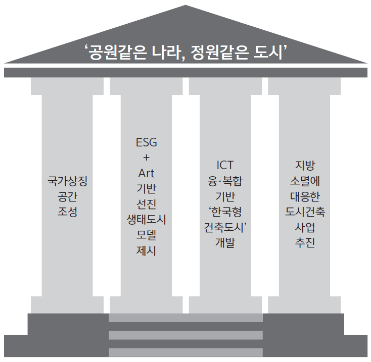 ‘공원같은 나라, 정원같은 도시’라는 이상이 실현되면 균형발전을 통해 우리 사회가 직면한 인구감소와 지방소멸의 문제, 경제적·문화적 격차의 문제, 기후변화 대응과 같은 현안들이 서서히 풀릴 것입니다. 이러한 어젠다(의제)들은 지금까지 정치적 이슈로만 제기돼 왔는데, 앞으로는 국건위가 나서서 국민 삶의 기반이 되는 도시건축환경을 개선하는 방식으로 해결하고자 합니다.