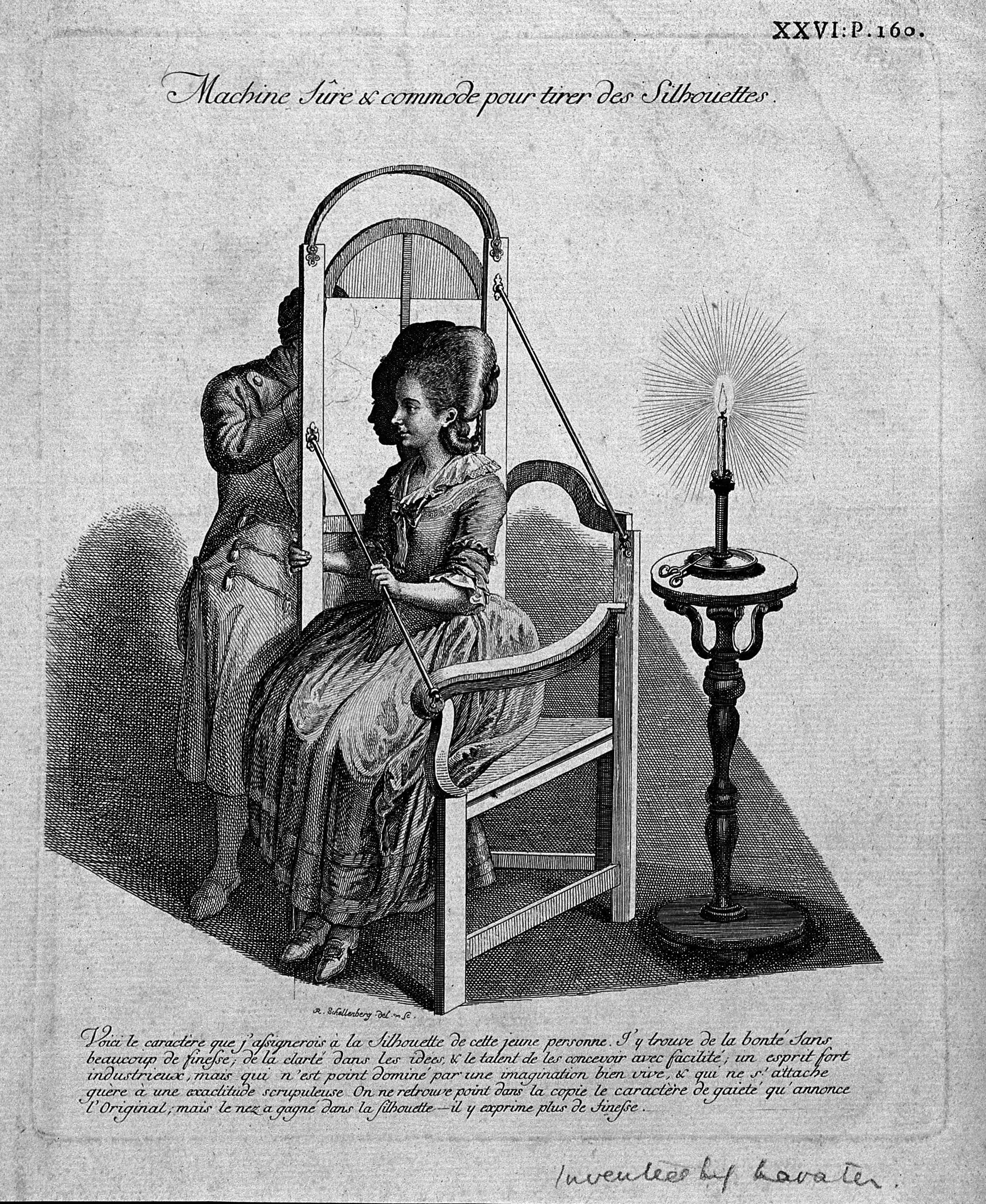 18세기 말에는 이런 이미지를 자동으로 제작할 수 있는 기계가 발명된다. 자동초상제작기(physionotrace)가 그것이다. 이미지를 재현하는 방법은 다음과 같다. 자신의 초상을 만들고자 하는 고객은 의자에 앉는다. 촛불이 의자 옆에 세운 초상 제작기에 고객 옆얼굴의 그림자를 만들어낸다.<사진 3> 화가가 축도기를 이용해 옆얼굴 그림자의 윤곽선을 따라가면 고객의 그림자 이미지를 적당한 비율에 따라 수학적 정확성으로 얻어내는 것이다.<사진 4> 이런 방식으로 불과 몇 분 만에 실루엣 이미지를 만들 수 있다. 실루엣 이미지를 얻은 뒤 솜씨 좋은 화가가 세부를 완성하기도 했다.<사진 5> 이런 기계의 등장은 단지 발명가의 순수한 열정으로 탄생하는 것이 아니다. 18세기 말 프랑스에서는 중산층이 늘어나기 시작했다. 신분 상승 욕구가 강한 그들은 귀족처럼 자신, 또는 자신이 사랑하는 가족이나 연인의 이미지를 간직하고 싶었다. 그러한 욕구가 기계의 발명을 촉진한 것이다.