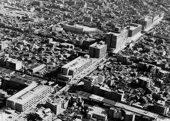 서울시 의뢰를 받은 김수근 사단이 설계를 맡는다. 재촉하는 발주자 탓에 무엇보다 시간이 부족하다. 프랑스 마르세유에 ‘수직 도시’를 적용한 르 꼬르뷔지에의 집합주택 위니떼 다비따시옹에서 층별 기능 분리와 근린주구를 참고하고, 1952년 영국 스미스 부부가 주창한 다층도시의 ‘공중 가로’에서 보차분리 개념을 빌려온다. 이 둘을 혼용해 세운상가 설계가 마련된다. 스케치 수준으로 완료된 이 설계가 걸작인지를 떠나 부지 형상에 맞는 깊은 고려가 있었는지의 문제와, 짧은 시간에 이뤄진 설계이다 보니 모방에 가까웠다는 사실만은 분명하다. 아울러 차단벽을 방불하는 이 집합건축물이 향후 주변은 물론 도시공간구조에 어떤 영향을 끼칠 것이란 예측 역시 부족했다는 점도 아쉬움으로 남는다. 그저 모든 게 속전속결이었다. 차단벽처럼 들어선 긴 건물군에 당시 조급성이 그대로 투영되어 보인다.