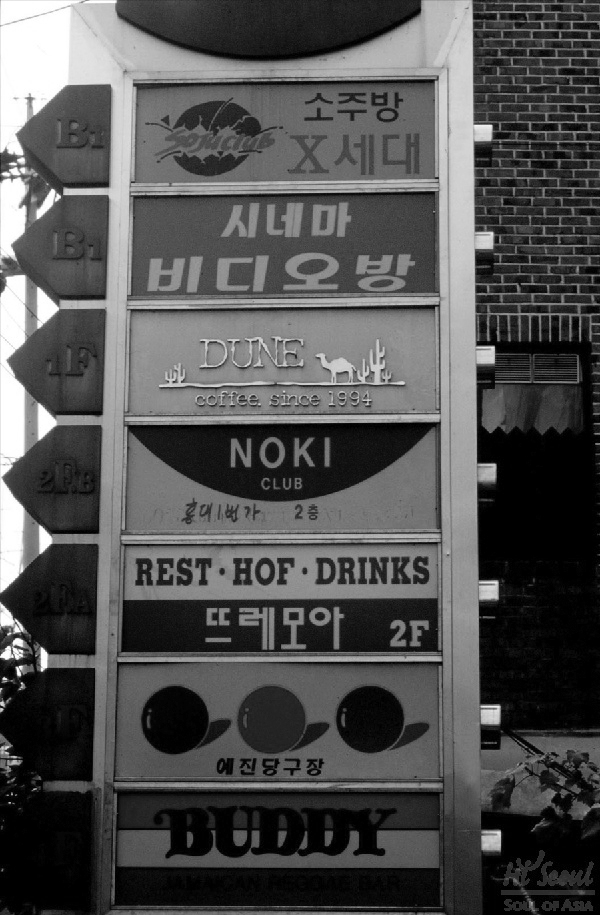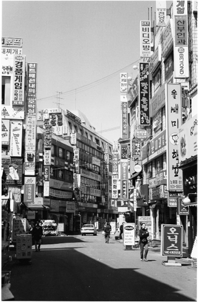 서울에서는 건설자재에 의해 만들어지는 외관에 더해, 광고로 건물의 외관이 만들어지는 건물들이 도시 경관을 압도한다. 사람들을 유인해 정보를 전달하기 위한 이 경관들은 상점의 외부 전체를 거의 덮는 광고판들이다. 이들 광고판들이 있는 건물의 경우 다른 건축 요소는 광고의 배경이 될 뿐이다. 광고의 큰 목소리는 그 자체로 다른 건물 유형의 외관 재료와 유사한 역할, 즉 거리의 시민들과 소통하고 건물의 용도를 대변하는 건설 자재 역할을 한다. 이러한 상업 건물들은 동질적 이질성을 띤다. 점포나 대형 건물, 쇼핑몰은 남과 차별화해야만 눈길을 끌 수 있다는 점에서는 이질성을 띠지만, 이들이 광고 목적으로 사용하는 외형적 도구가 항상 같다는 점에서는 동질성을 띤다. 사람들의 관심을 끌기 위한 거리에서의 광고 경쟁은 모두가 참여하는 상황에서 경쟁의 효과는 줄어들 뿐이나 더 큰 효과를 위한 더 자극적인 광고는 지속적으로 서울의 경관을 채워가고 있다.