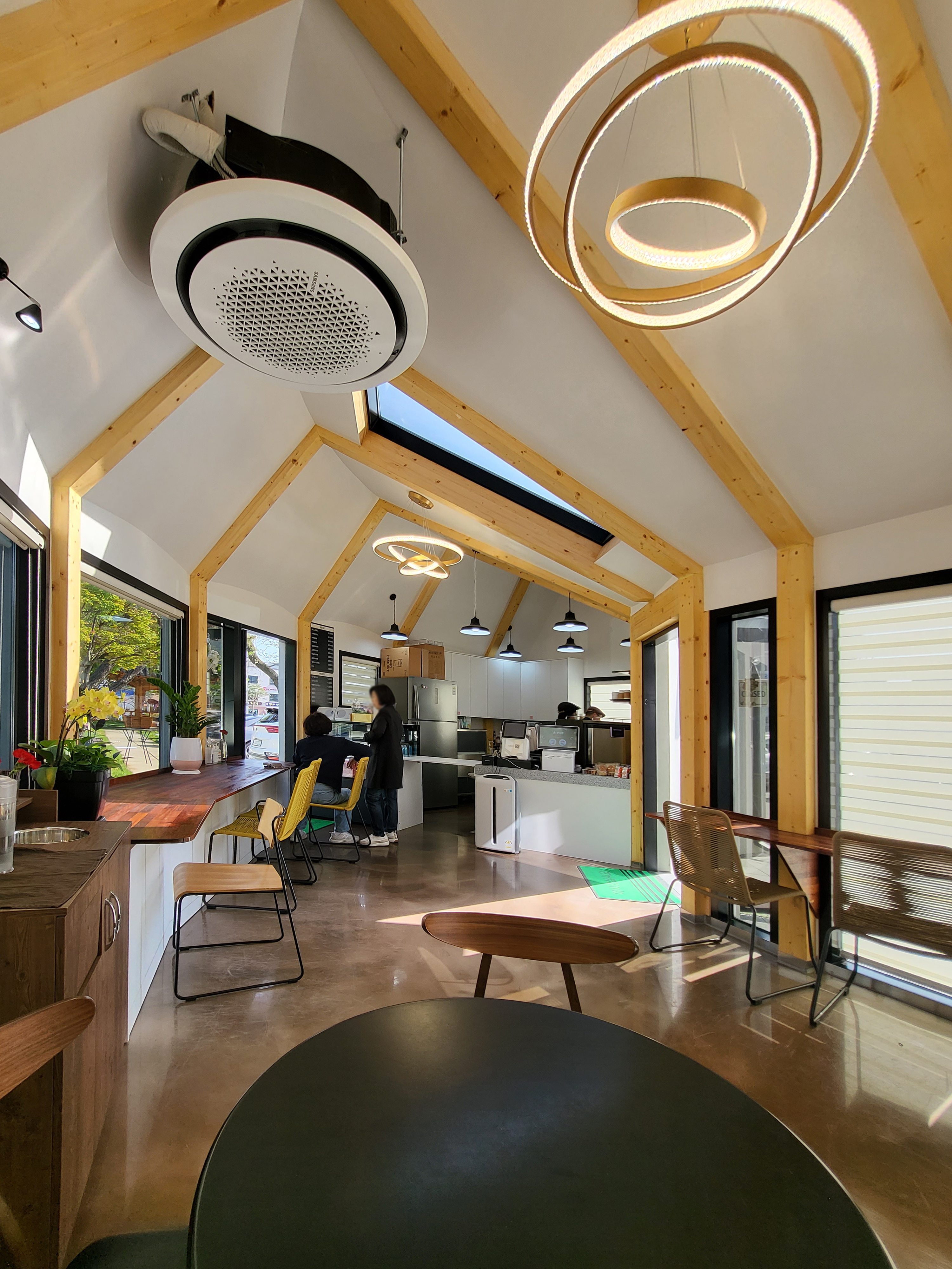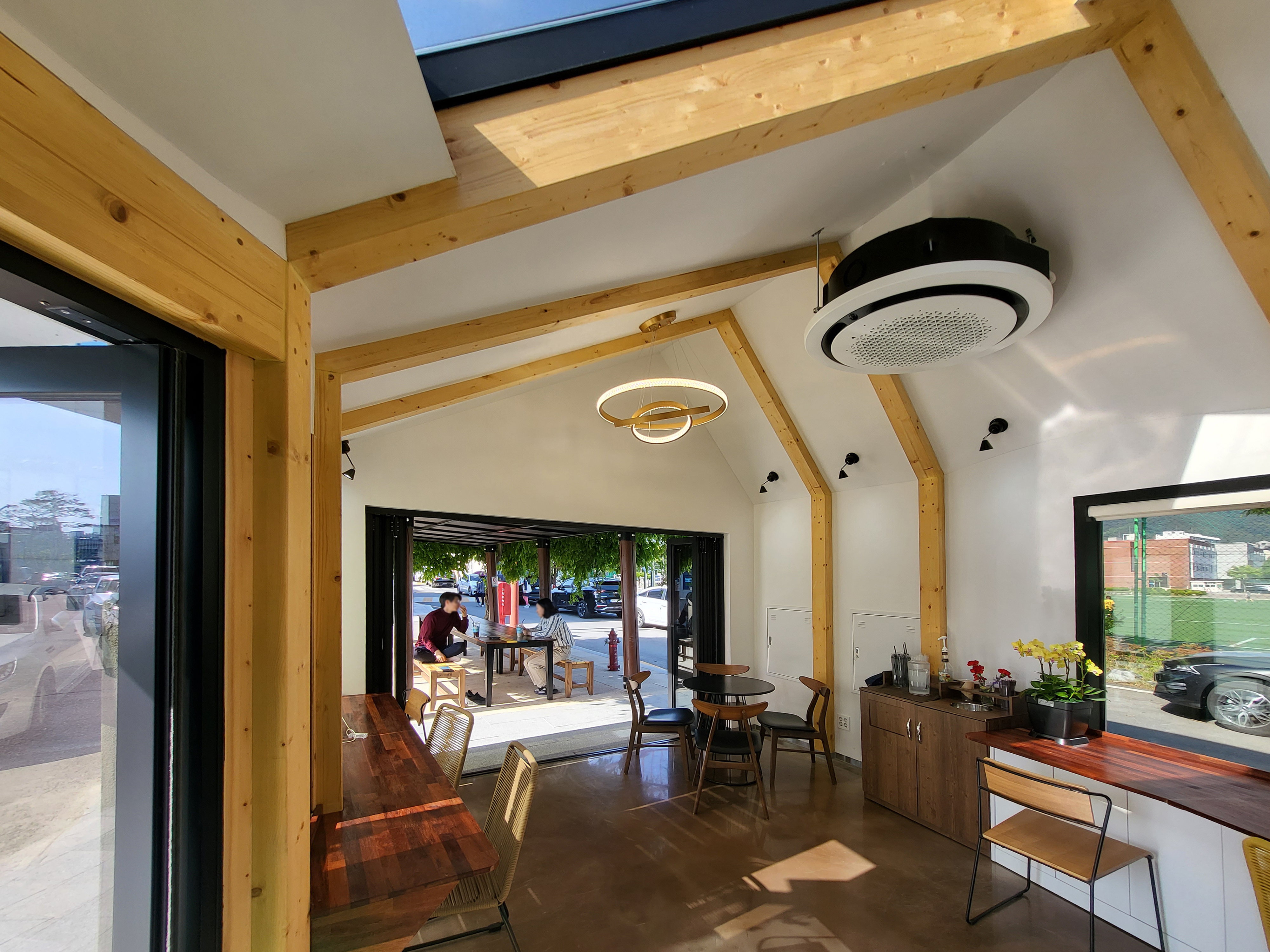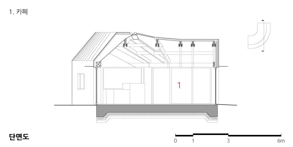 카페 계획 단계에서 공간의 활용을 고민하면서 구조를 어떻게 풀어나갈 것인가에 대한 토의가 주를 이뤘다. 선택한 중목구조는 등나무 쉼터와 맥락을 같이 하는 재료 중 하나라고 생각했고, 좁은 내부의 개방성을 위해 천창을 계획하여 카페 이용 시 자연을 확장시키는 공간으로 만들어 나가고자 했다.