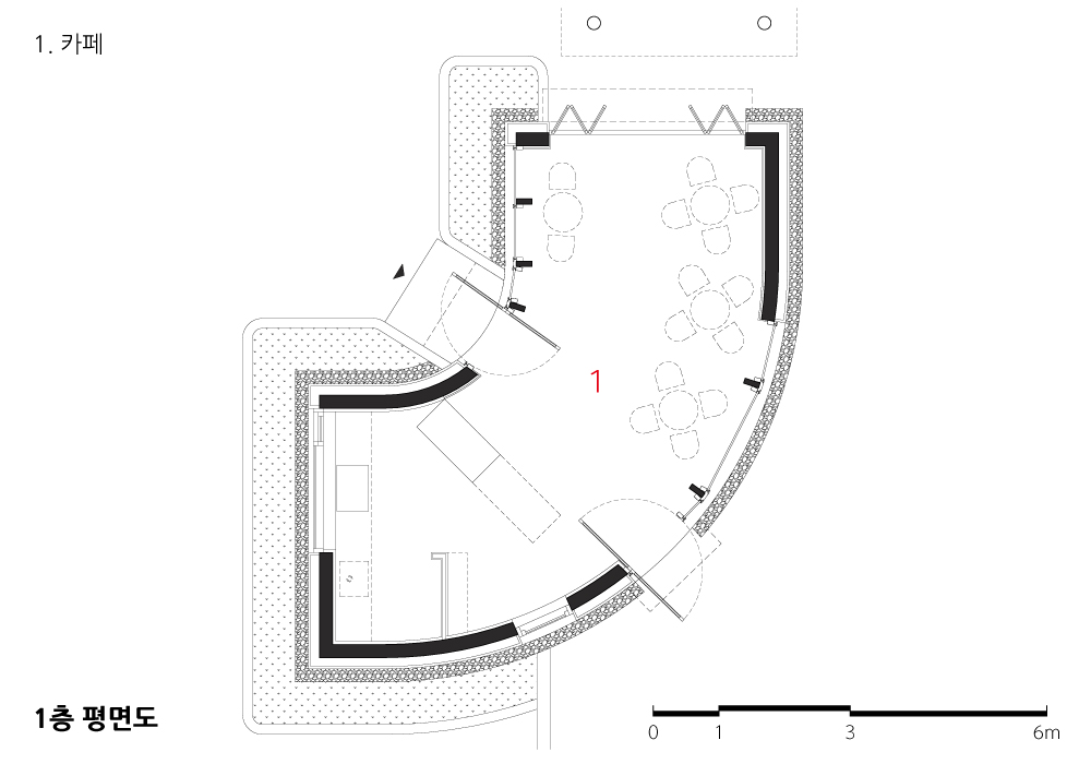제시된 35제곱미터라는 작은 면적을 어떻게 풀어나갈 것인가 하는 문제는 계획의 첫 단계에서부터 많은 고민을 가져다주었다. 또한 군청을 이용하는 이용자들이 카페를 바라보는 정면성과 카페 주 이용자의 이용 방향은 서로 상이한 축을 형성했다. 이를 해결하기 위한 방법으로 두 방향을 아우르며 시각적 변화를 줄 수 있는 곡선형 매스를 계획하여 부드럽게 열린 군청의 이미지를 구축하고자 했다.