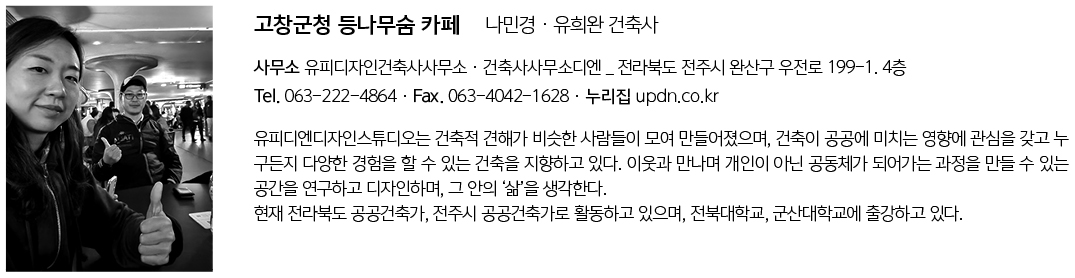 | 고창군청 등나무숨 카페 설계자 | 나민경 · 유희완 _ 유피디자인건축사사무소 · 건축사사무소디엔 건축주 | 고창군청 시공사 | 월성 설계팀 | 장은혜, 강문희 대지위치 | 전라북도 고창군 고창읍 중앙로 245 주요용도 | 업무시설(제1종 근린생활시설) 대지면적 | 6,278.00㎡ 건축면적 | 34.50㎡ 연면적 | 34.50㎡ 건폐율 | 0.55% 용적률 | 0.55% 규모 | 1F 구조 | 중목구조 외부마감재 | 외단열시스템 내부마감재 | 수성페인트 설계기간 | 2022. 10 – 2022. 12 공사기간 | 2023. 01 – 2023. 03 사진 | 유희완 구조분야 | (주)수피아건축 기계설비분야 | 대화엔지니어링 전기분야 | 대화엔지니어링 |