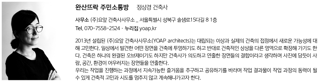 ‘완산뜨락 주민소통방’은 마을의 골목 모퉁이를 환히 밝히는 만남의 공간이자 쉼터로, 이웃의 삶을 나누는 공간을 그리며 설계했다. 이웃 간의 만남 빈도를 높일 수 있는 다양한 건축적 장치를 고민했다. 작은 공공건축물로서 외부에서 더 쉽고 친근하게 접근하고, 내부의 공간이 충분히 관찰되는 것이 건물의 주요 개념이 되었다. 건축공간을 확장하고 골목길에 아이덴티티를 부여하는 골목길 디자인을 함께 제안했다. 골목길 디자인을 통해 건축과 마을이 친밀히 엮이며 생동감있는 흐름을 생성하는 것을 목표로 삼았다.