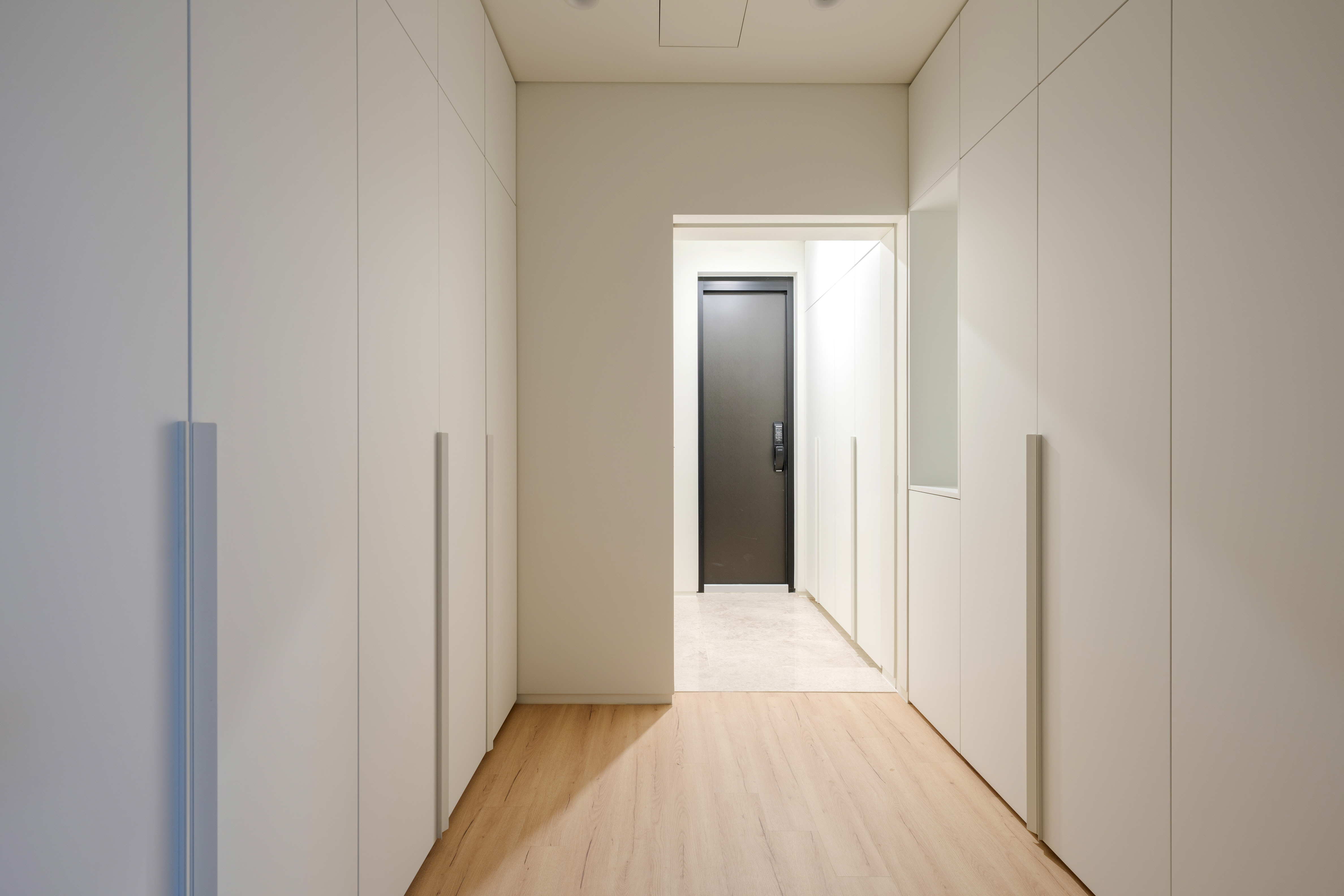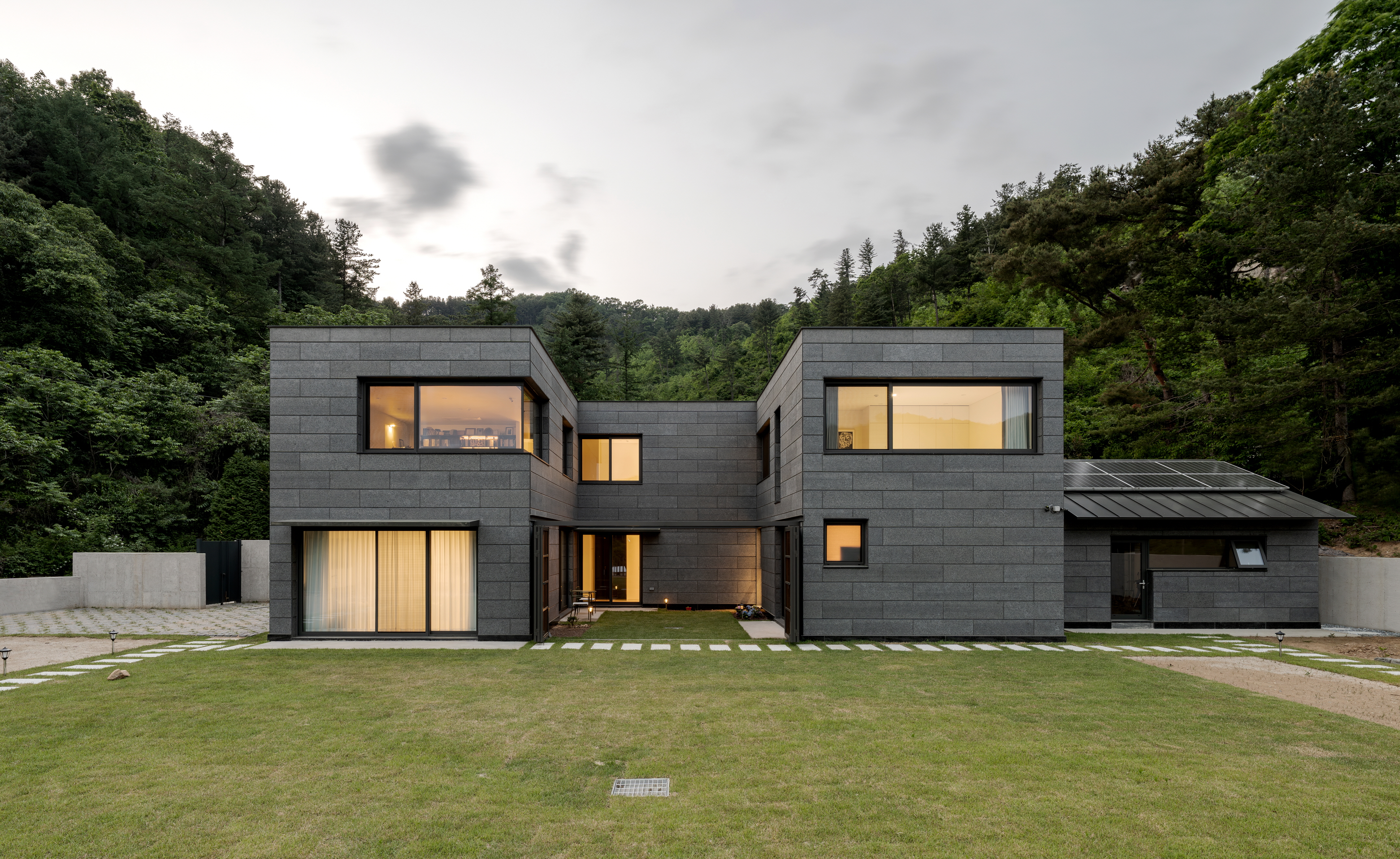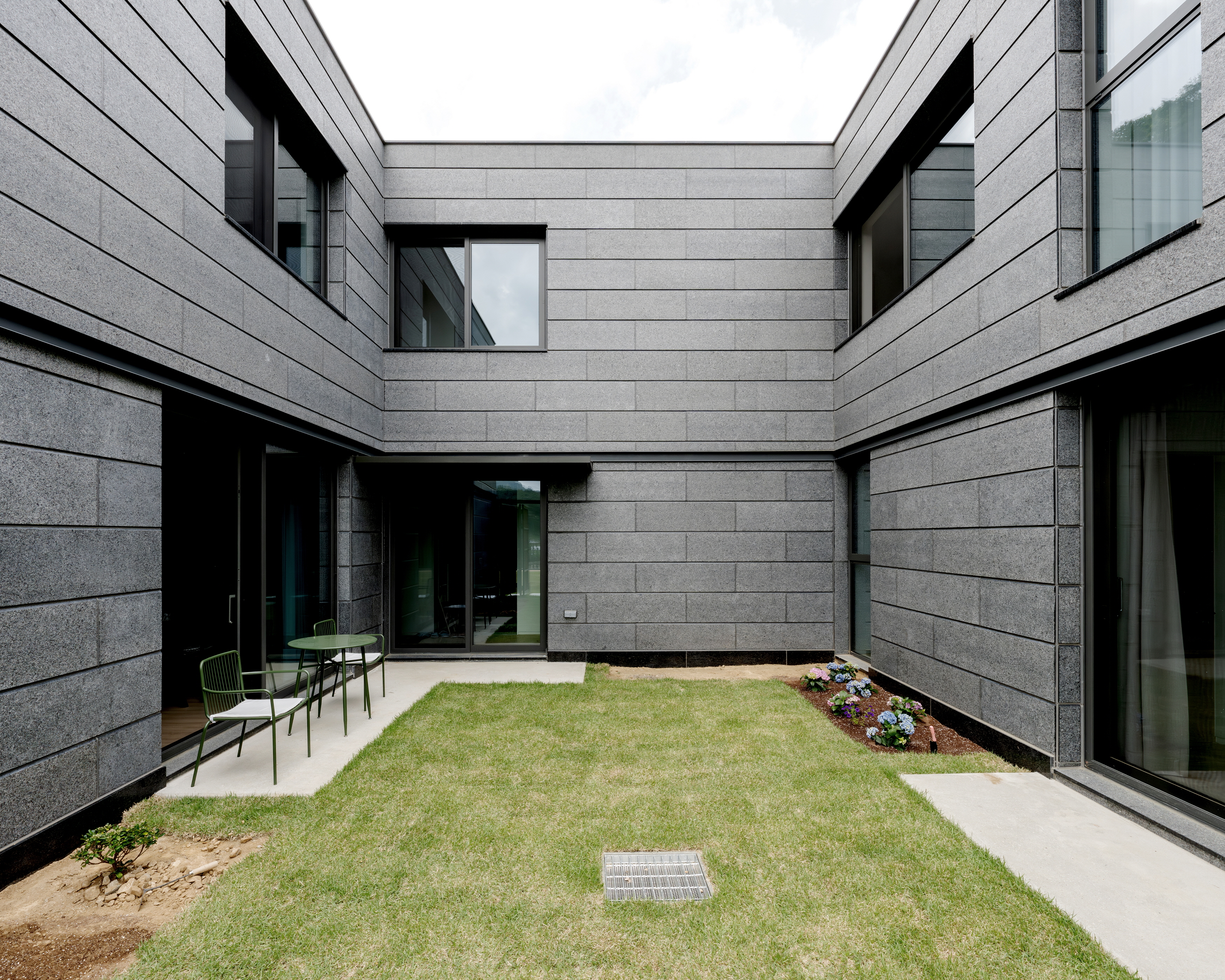 건축주는 단아하고 단단하며 양감이 있고 절제된 기하학적 언어를 쓰길 원했다. 따라서 직선, 수평, 수직선을 기반으로 전체 기하 언어를 정돈하며 구성했다. 외장재에서도 꾸밈없이 정갈한 분위기를 자아내기 위해, 단아한 화강암을 단일 재료로 디테일들을 계획했다. 자연의 품 안에서 도드라지지 않고 겸허하게 자리하기 위해 낮은 채도의 석재를 선택했다. 또 선형의 미를 고양시키기 위해 석재의 가로줄눈을 강조하려 했고, 그러기 위해 단일 판석의 상단부를 45도 커팅하여 음영이 더 드리우게 계획했다.
