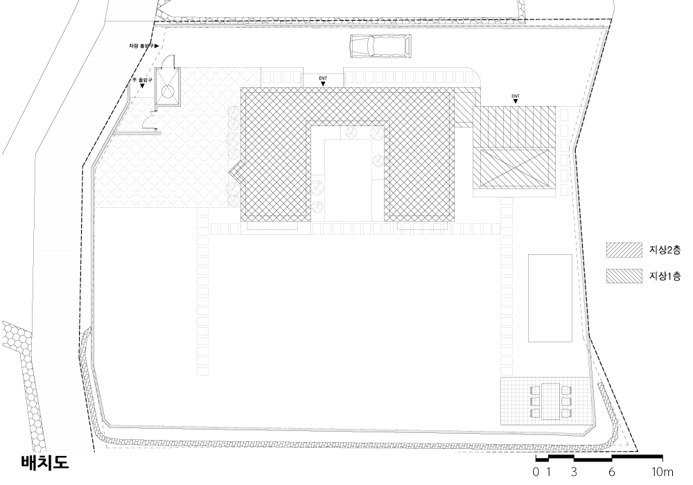 넓은 대지에 독존하는 형태의 단일 매스를 구축하는 것보다, 대지에 녹아드는 형태를 만들기 위해 ‘ㄷ’자형 매스로 디자인하여 중정을 구성했다. 또한 별도의 창고나 실내주차장 매스를 본동으로부터 이격해 배치함으로써, 전체적으로 대지의 장축을 선형으로 점유하도록 계획했다. 전체 대지 안에 뒷산과 건물, 담장들로 둘러싸인 너른 마당을 구축하려 했다.