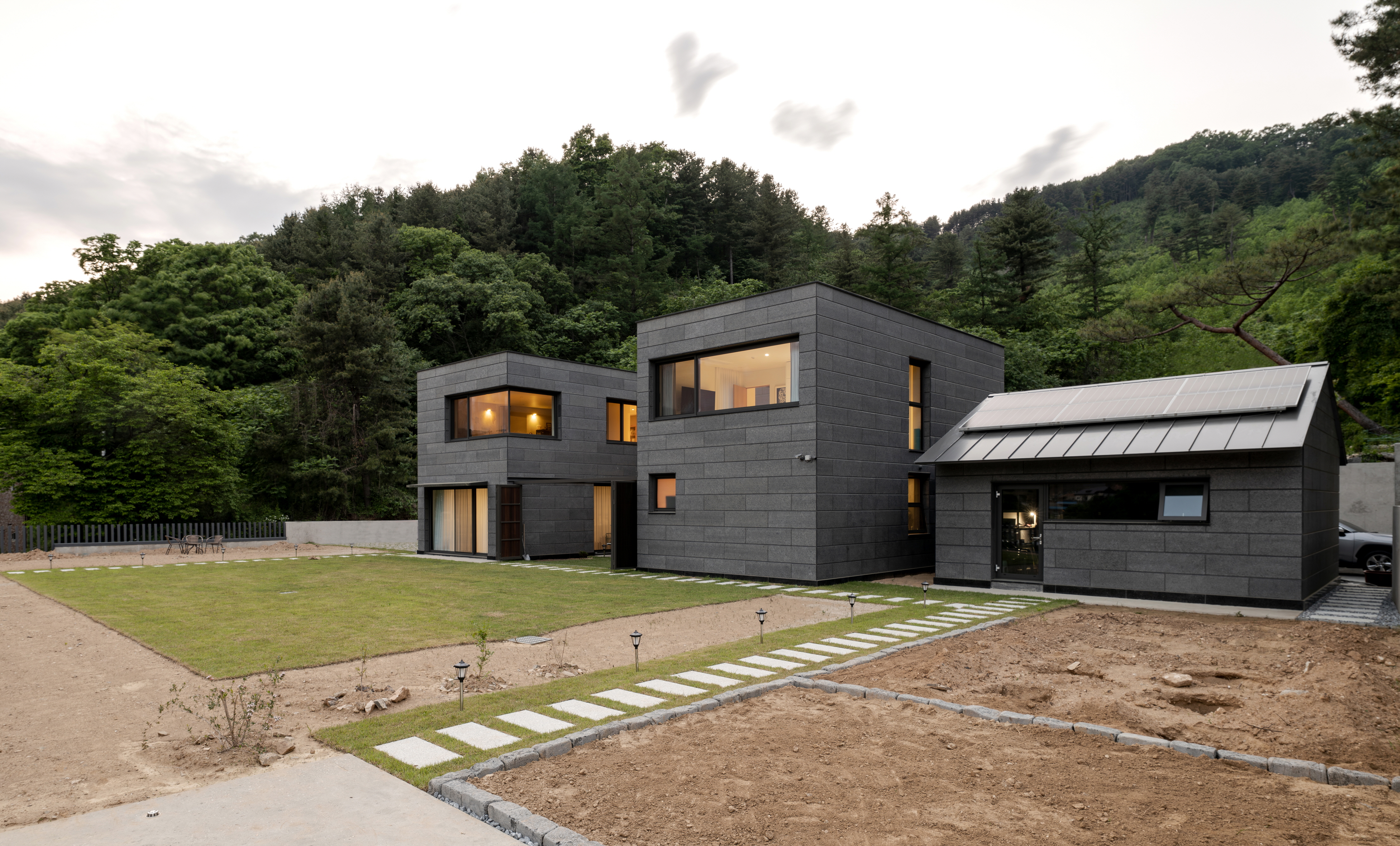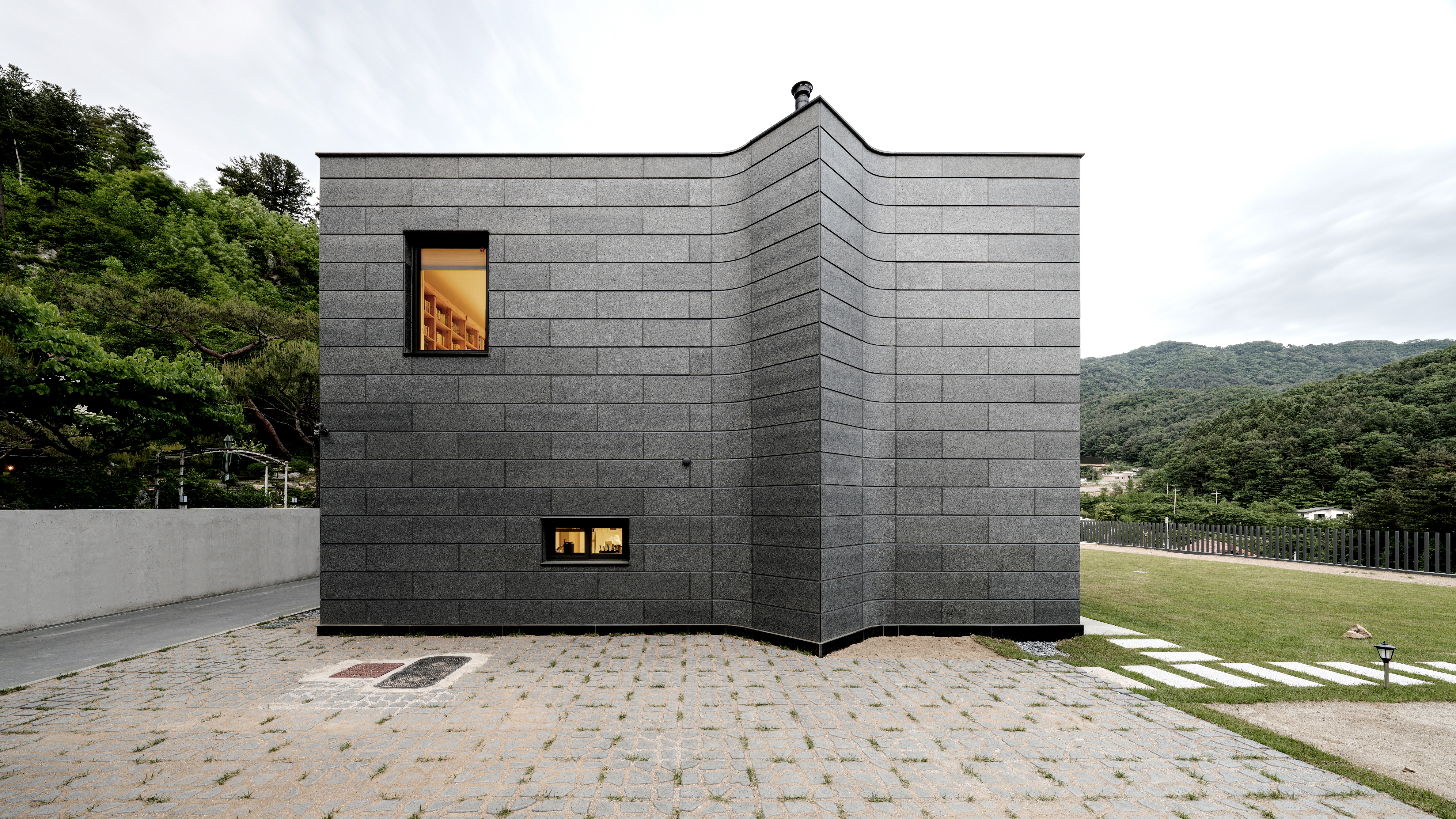 건축주는 단아하고 단단하며 양감이 있고 절제된 기하학적 언어를 쓰길 원했다. 따라서 직선, 수평, 수직선을 기반으로 전체 기하 언어를 정돈하며 구성했다. 외장재에서도 꾸밈없이 정갈한 분위기를 자아내기 위해, 단아한 화강암을 단일 재료로 디테일들을 계획했다. 자연의 품 안에서 도드라지지 않고 겸허하게 자리하기 위해 낮은 채도의 석재를 선택했다. 또 선형의 미를 고양시키기 위해 석재의 가로줄눈을 강조하려 했고, 그러기 위해 단일 판석의 상단부를 45도 커팅하여 음영이 더 드리우게 계획했다.