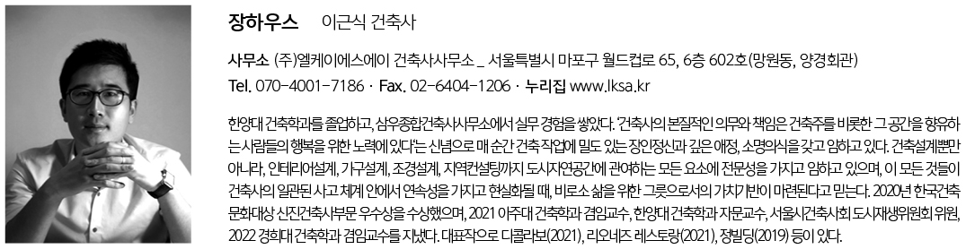 | 장하우스 설계자 | 이근식 _ (주)엘케이에스에이 건축사사무소 건축주 | 장재연 감리자 | 이근식 _ (주)엘케이에스에이 건축사사무소 시공사 | (주)파인씨앤디 종합건설 설계팀 | 조명선, 권승배 대지위치 | 경기도 양평군 서종면 서정로 67-44 주요용도 | 단독주택 대지면적 | 1,396.00㎡ 건축면적 | 161.79㎡ 연면적 | 280.75㎡ 건폐율 | 11.59% 용적률 | 17.53% 규모 | 2F 구조 | 철근콘크리트구조 외부마감재 | 석재 내부마감재 | 석고보드 위 도장 설계기간 | 2021. 09 – 2022. 04 공사기간 | 2022. 05 – 2023. 05 사진 | 구의진 구조분야 | 서전 구조엔지니어링(주) |