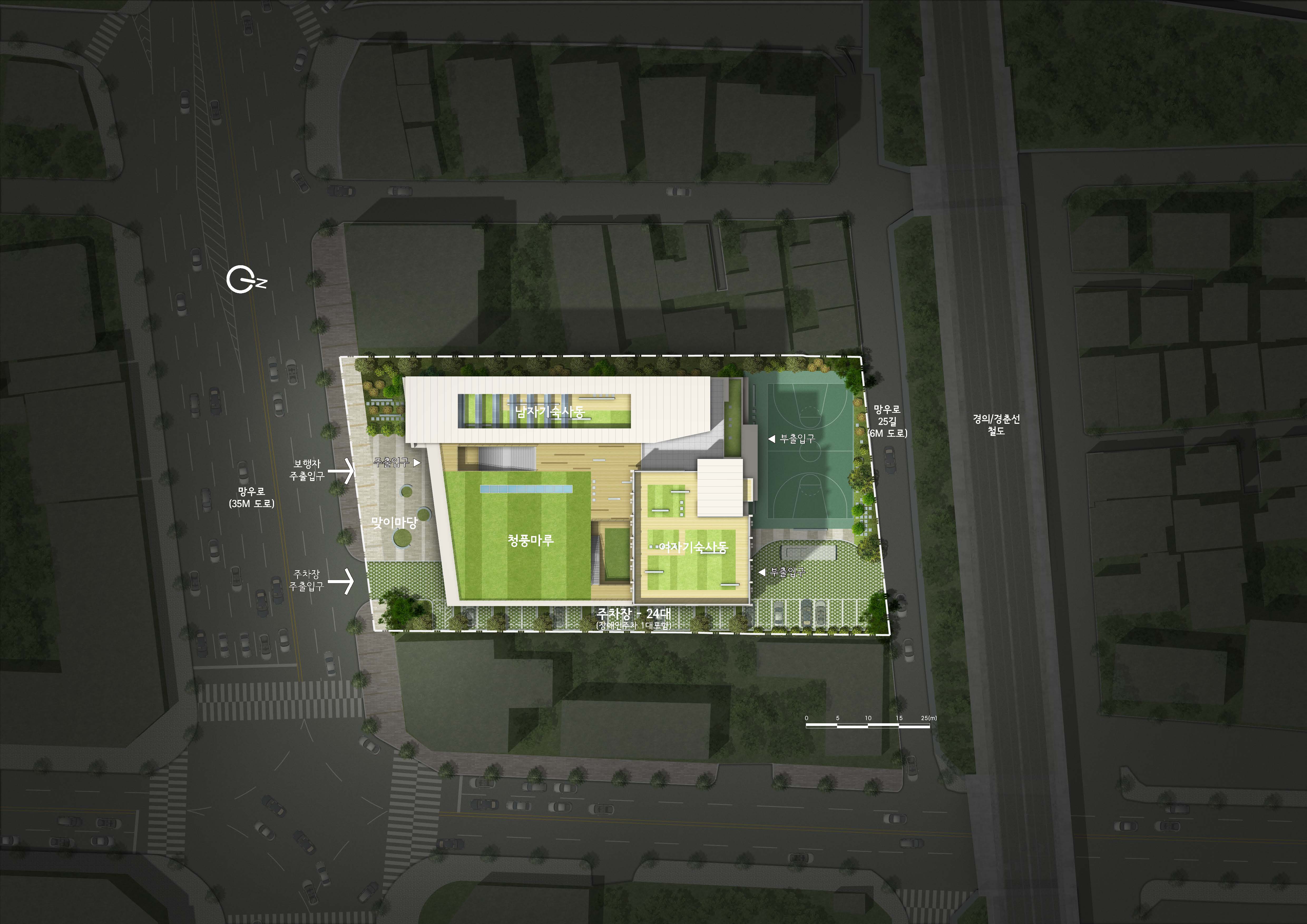 이와 같은 대지의 두가지 문제를 해결하기 위하여 공공영역과 사적영역을 수직적으로 분리했다. 측벽 이용과 부유하는 매스디자인을 통해 소음 문제를 해결하며, 상징적인 건물이 될 수 있도록 계획했다.
