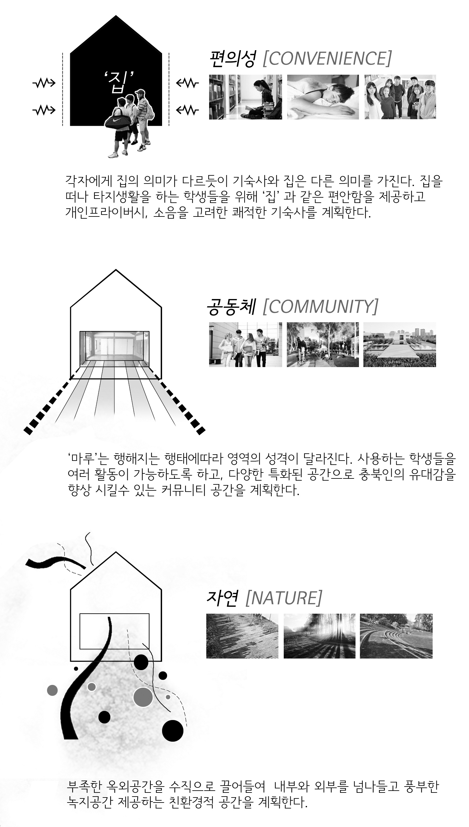 공공영역은 내·외부가 연계되는 커뮤니티 공간으로 계획했다. 이 공간은 사용하는 학생들이 여러 활동을 하면서, 충북인의 유대감을 향상시킬 수 있는 다양하고 특화된 커뮤니티 공간이 된다. 그리고 부족한 옥외공간을 수직으로 끌어들여 내부와 외부를 넘나들고 풍부한 녹지공간을 제공하는 친환경적 공간을 계획했다.