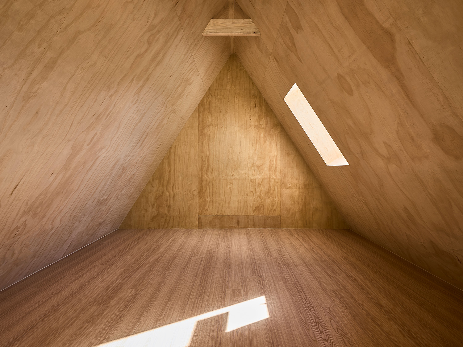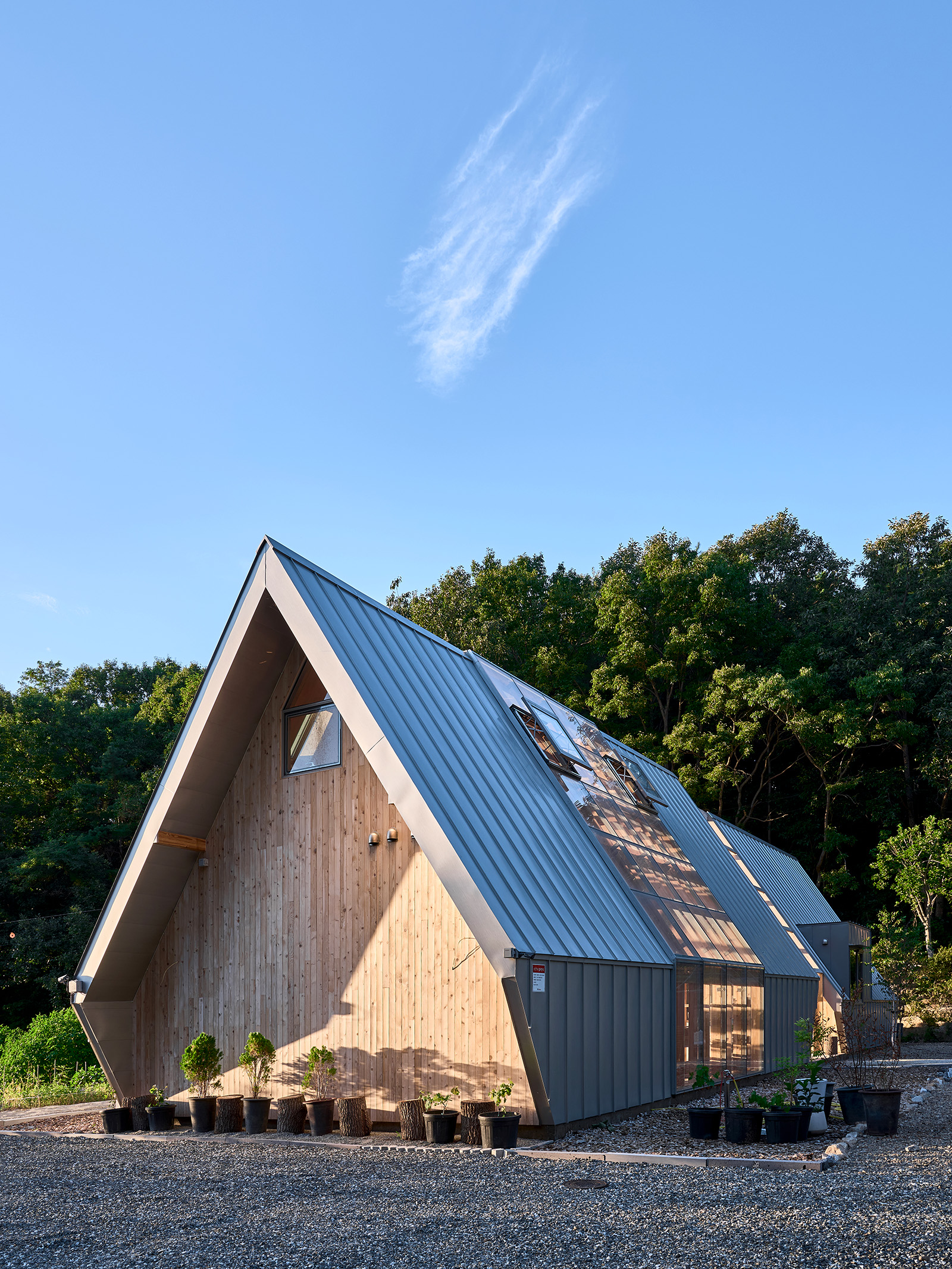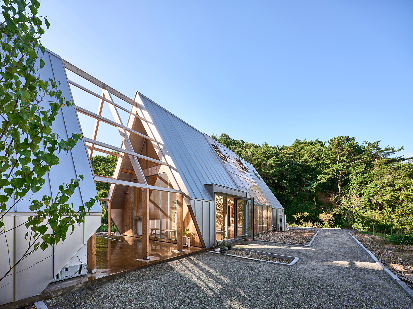 나무는 그 수종에서부터 다양한 종류와 형태, 특징을 지니고 있다. 그럼에도 많은 사람들이 기억하는 가장 보편적이고 원초적인 나무의 형태는 삼각형을 이루는 기하학적 형태이다. 기하학은 가장 완결적이면서 동시에 단순한 형태이다. 이 완결적인 형태의 이등변 삼각형은 놓이는 각도에 따라서 벽과 지붕이 결합될 수 있는 가능성을 보여주었다. 흔히 경량목구조의 구조재로 사용되는 SPF 구조목의 사이즈는 20피트, 대략 6.1미터이다. 60도로 기울어진 각도에 6.1미터의 구조목을 설치하면, 목재의 손실 없이 대략 1~2개 층으로 사용가능한 층고를 확보할 수 있다. 벽과 지붕의 경계가 모호한 이 이등변삼각형 형태는 목구조 공사의 공정을 최소화시켜준다.
