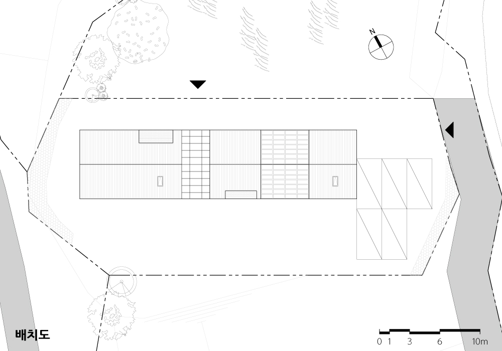 건축물의 배치는 경사지로 이루어진 대지에 각각의 매스를 어떻게 앉힐까에 대한 고민에서부터 시작한다. 대지의 진입은 경사를 따라 가장 낮은 곳에서부터 서서히 올라가는 방식인데, 진입을 하면서 인지되는 건축물의 시퀀스가 다르게 느껴지기를 의도했다. 대지 전면부에 드러난 매스는 초입에서 위를 올려다보았을 때 자연에 순응하여 조화롭지만, 강한 인상을 주기를 바랐다. 주변의 녹음과 조화된 매스는 자작나무의 수피처럼 은회색의 존재감을 드러낸다. 중턱에 다다르면 전면 매스와 지형에 가려졌던 자작나무와 오두막들이 서서히 드러난다. 작은 규모로 얼기설기 군락을 이루며 배치된 나무들과 오두막은 주변의 녹음과 자연스럽게 관계를 맺게 될 것이다.