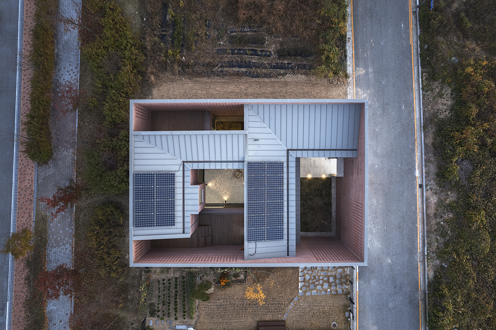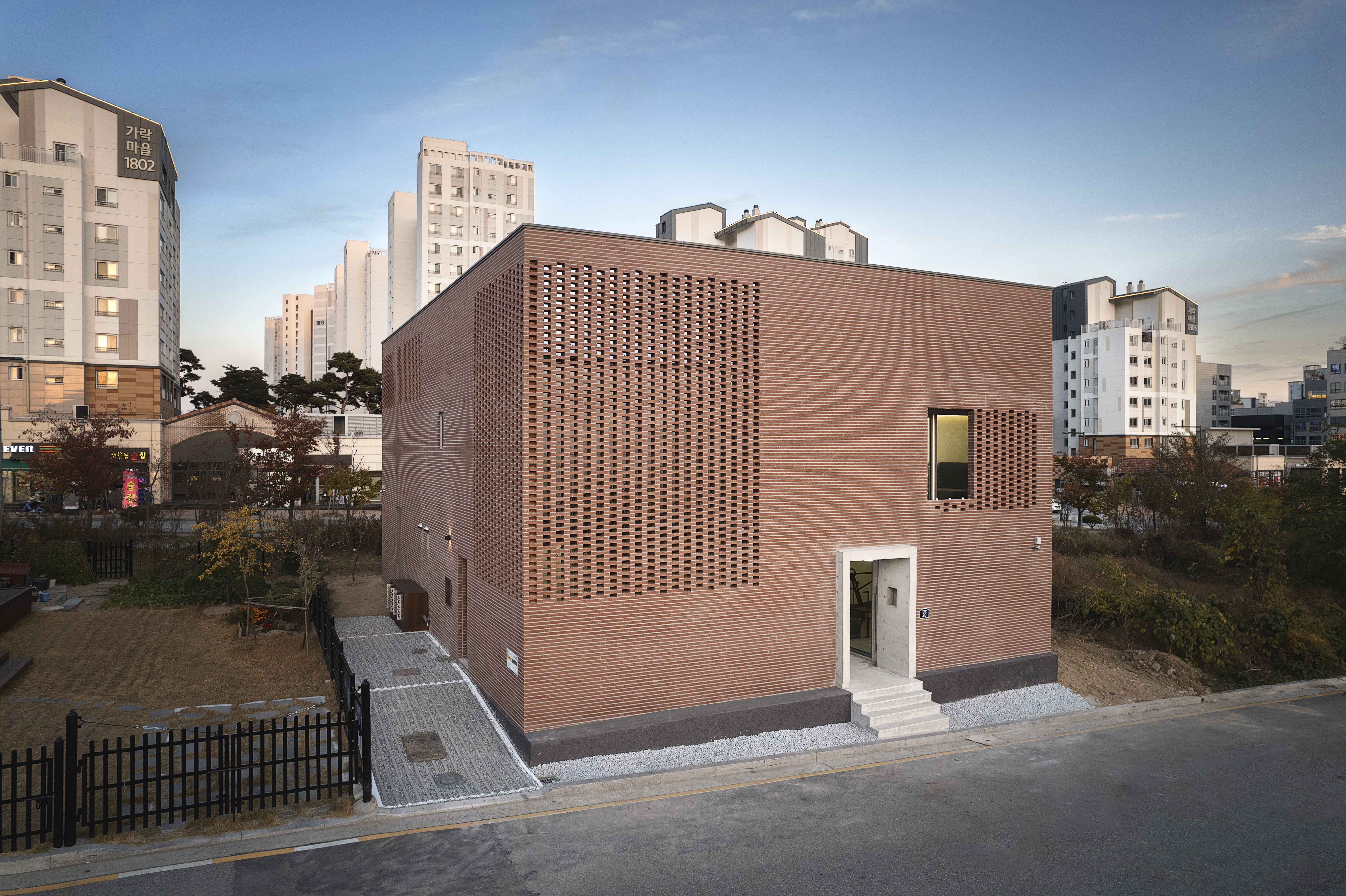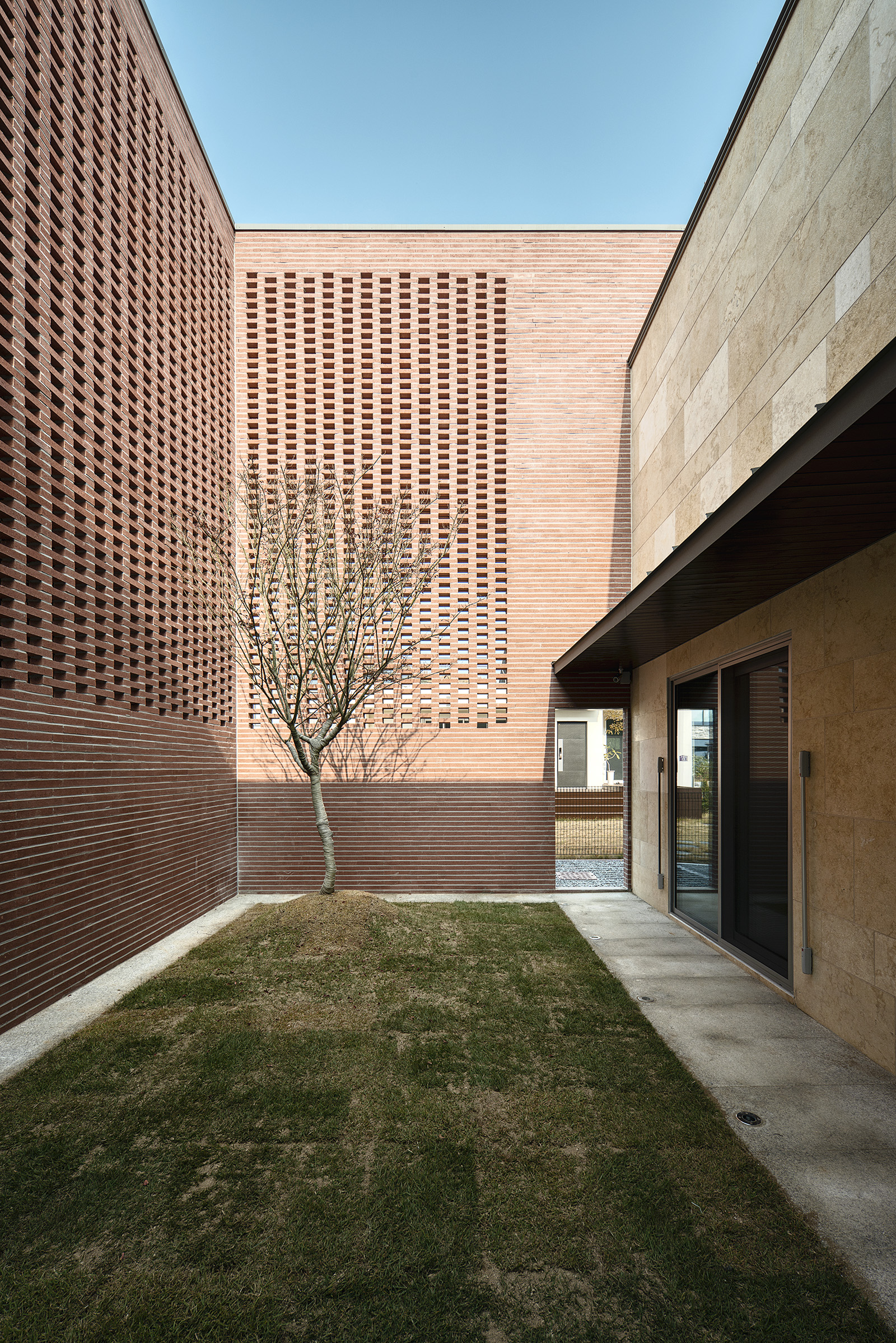 건축한계선을 따라 빈 곳 없이 네모반듯 올린 탓에 이웃 주택보다 덩치가 조금 커 보이긴 하지만 그다지 위압적이지 않다. 한눈에도 속이 꽉 찬 덩어리가 아닌 것을 눈치챌 수 있기 때문이다. 비구조요소로서 내진성능으로부터 자유로운 외벽 곳곳은 영롱쌓기가 되어있는데, 뒷공간이 비어 있어서 낮에도 밤에도 벽돌 틈 사이로 늘 어느 정도 빛이 새어 나와 그 두께를 확인시켜 준다. 그로 인해 이 조적 구조물은 육중한 덩어리가 아니라 상대적으로 얇고 가벼운 꺼풀처럼 보이기 시작한다.