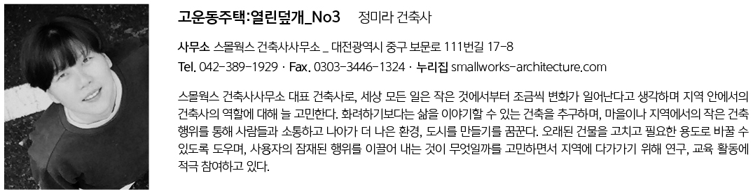 | 고운동주택:열린덮개_No3 설계자 | 정미라 _ 스몰웍스 건축사사무소 건축주 | 배유리 감리자 | 정미라 _ 스몰웍스 건축사사무소 시공사 | 건축주 직영 설계팀 | 최상아 설계의도 구현 | 스몰웍스 건축사사무소 대지위치 | 세종특별자치시 고운북10길 20 주요용도 | 단독주택 대지면적 | 330.00㎡ 건축면적 | 129.25㎡ 연면적 | 193.02㎡ 건폐율 | 39.17% 용적률 | 58.49% 규모 | 2F 구조 | 철근콘크리트구조 외부마감재 | 치장벽돌(두라스텍:콘크리트벽돌 제품명S390탱고레드) 내부마감재 | 내벽마감(벤자민무어페인트:SCUFF-X에그쉘광cotten ball) 2층바닥마감(동화마루:듀어텍스쳐 까사 텐오크DT204) 1층바닥마감(시우타일:BLANC 1024) 설계기간 | 2021. 01 - 2021. 07 공사기간 | 2021. 08 - 2022. 11 사진 | 천영택 구조분야 | 주연구조엔지니어링(주) 기계설비분야 | 다온이엔씨 전기분야 | 우경이엔지 |