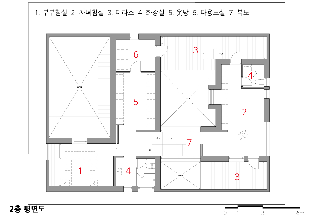 Once you pass through the massive wall and enter the courtyard, which is external but becomes internal, you can finally access the individual living spaces inside the house. When entering the interior of the house, you encounter the courtyard once again, representing the external within the internal. While the courtyard is the place that directly connects with the outer residential area, the central courtyard is a space only accessible to family members. Creating a circulation path on both the first and second floors emphasizes the character of the central courtyard as external yet internal. This house, with its character of being external yet internal, turns the openness that should extend to the outside residential area back into the interior, completing the nature of an “Open Roof - Covering.”