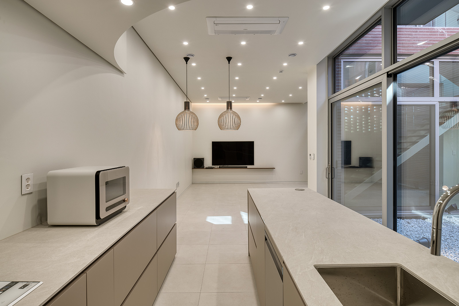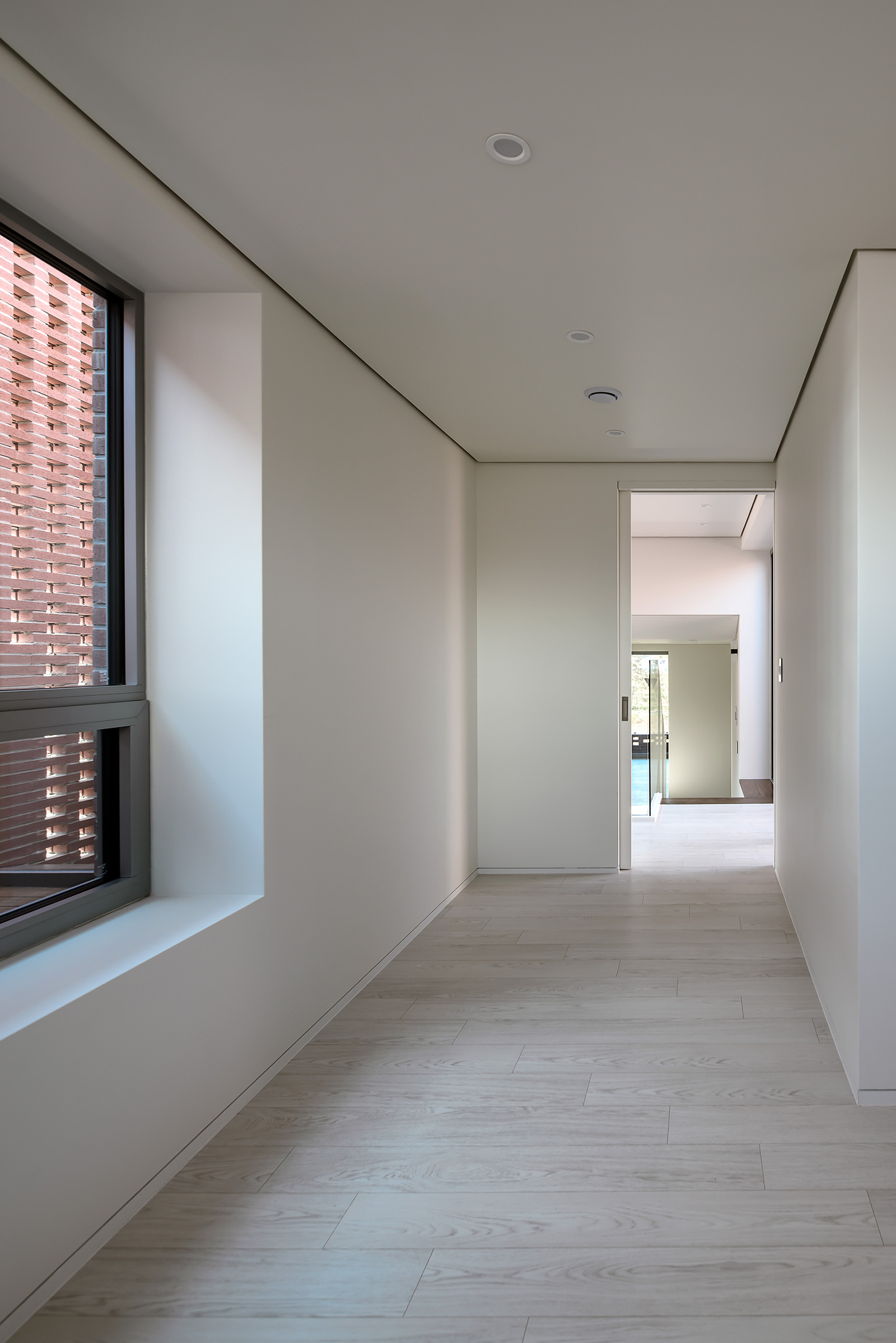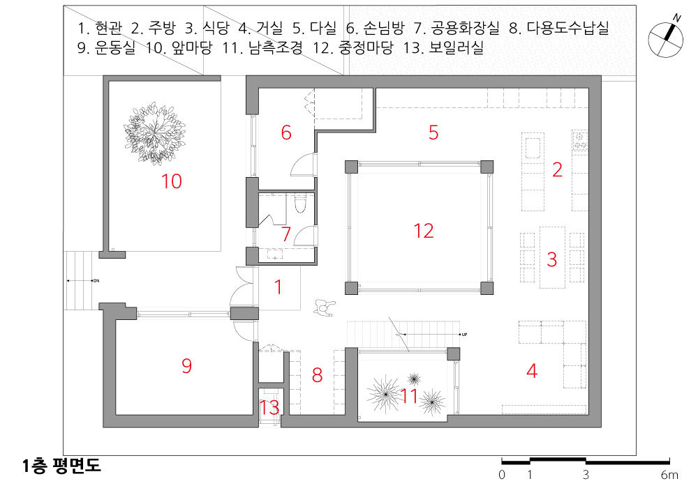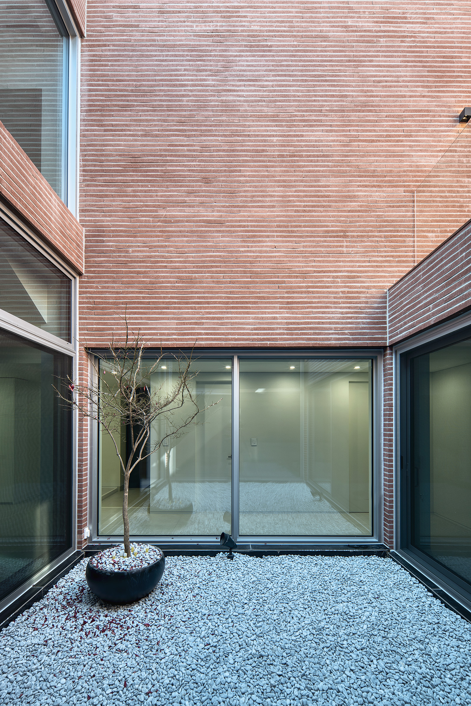 거대한 벽을 지나 외부이지만 내부인 앞마당을 들어서면 비로소 개인적인 공간인 주택으로 접근할 수 있게 된다. 주택 실내로 들어서면 다시 한번 중정, 즉 외부인 내부를 마주하게 된다. 앞마당이 최전방의 외부인 주택단지와 직접적으로 닿는 곳이라면, 중정은 가족 구성원들만이 서로 닿는 곳이다. 1층과 2층 모두 순환하는 동선을 만들어 중정의 외부이면서 내부인 성격을 강하게 느낄 수 있게 했다. 외부이면서 내부인 성격의 주택은 주택단지 외부로 열려야 하는 개방감을 주택 내부로 돌리며 열린-덮개로의 성격을 완성시킨다.